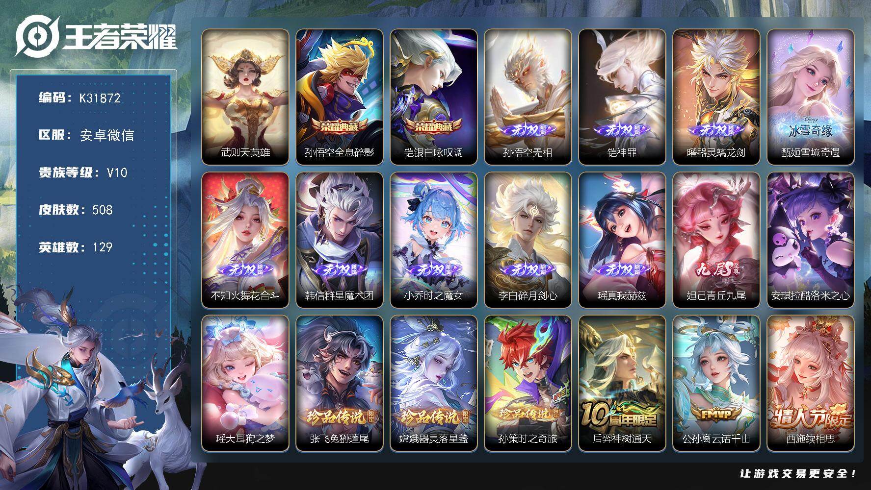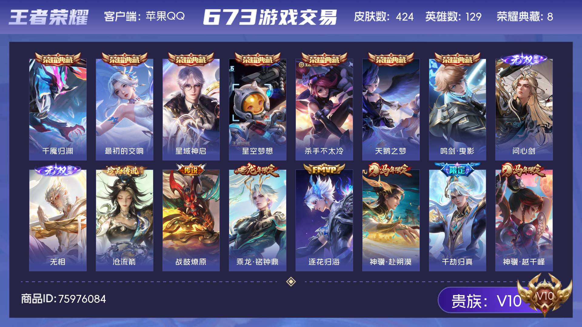 V10 皮肤424 英雄129 至圣王者 荣耀典藏8 无双皮肤2 珍品传说1 传说44 其他皮肤376