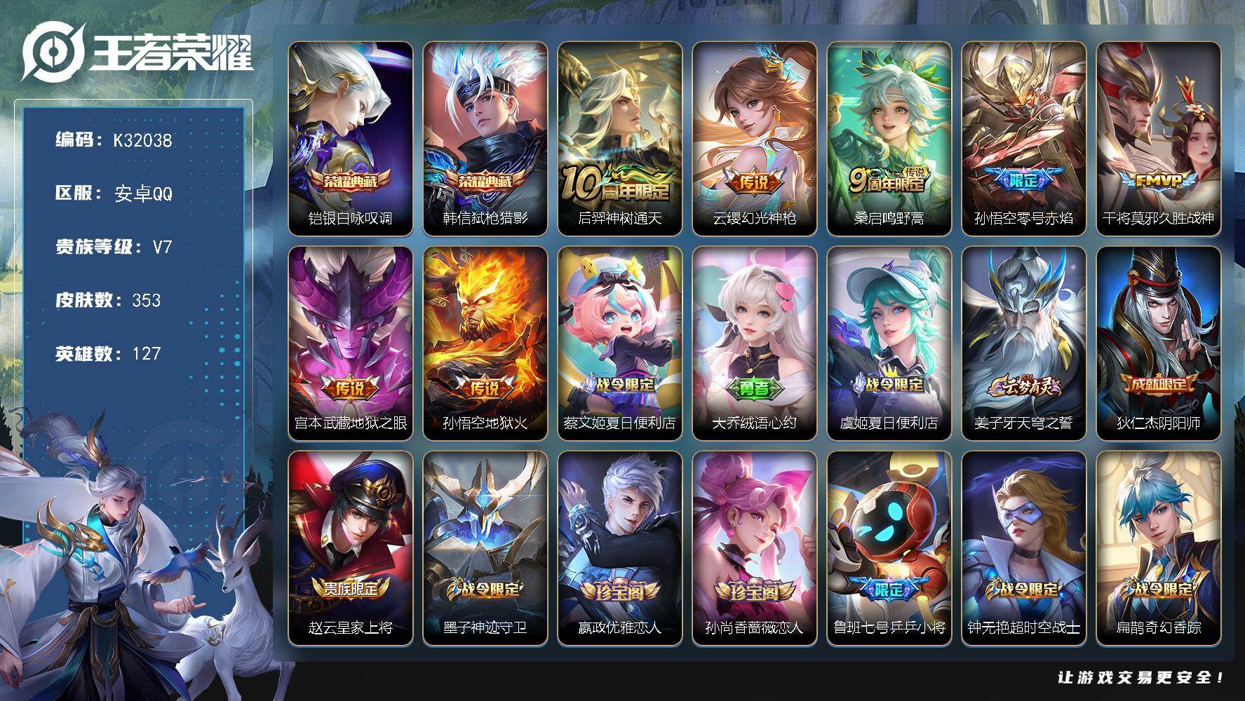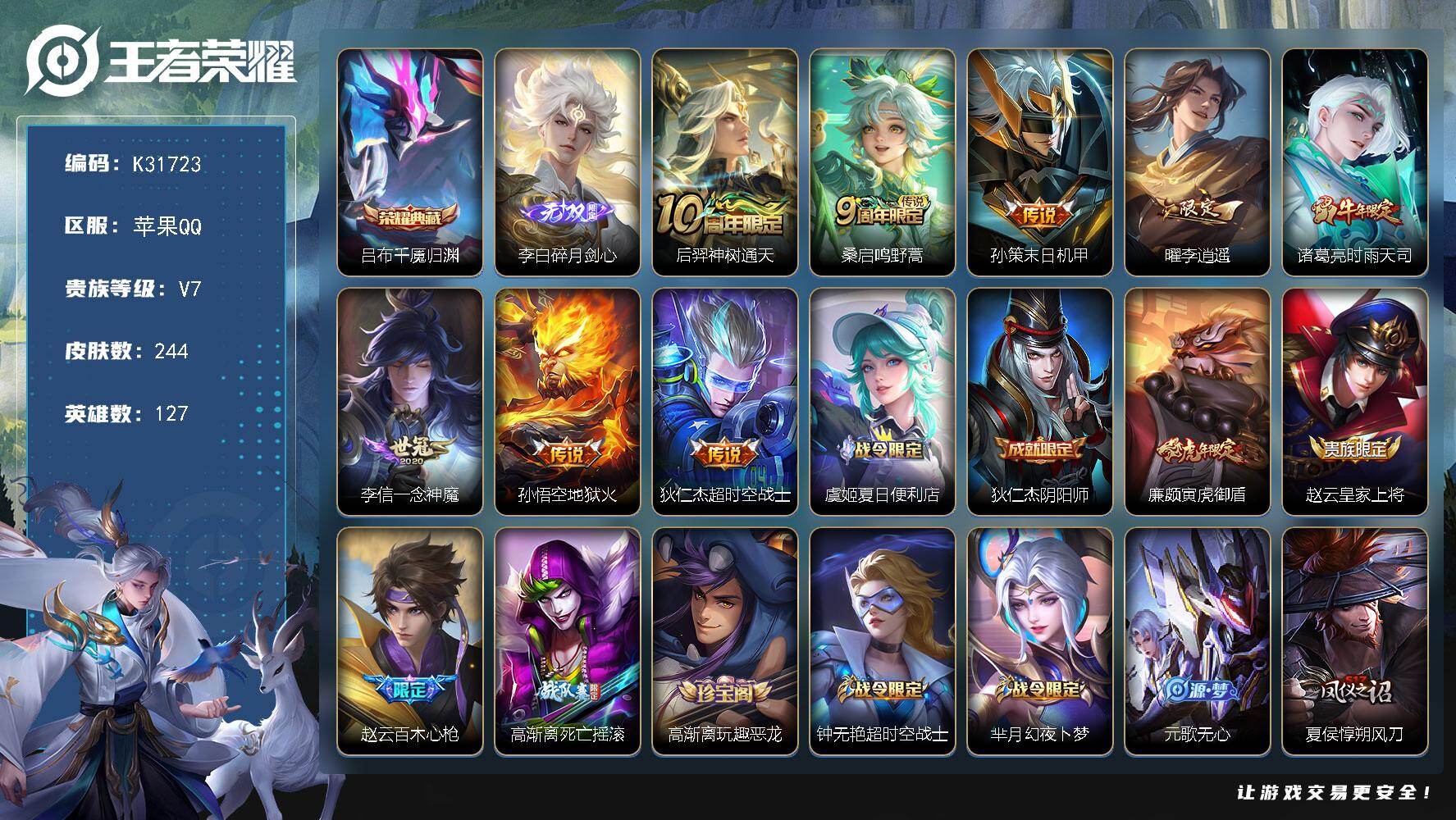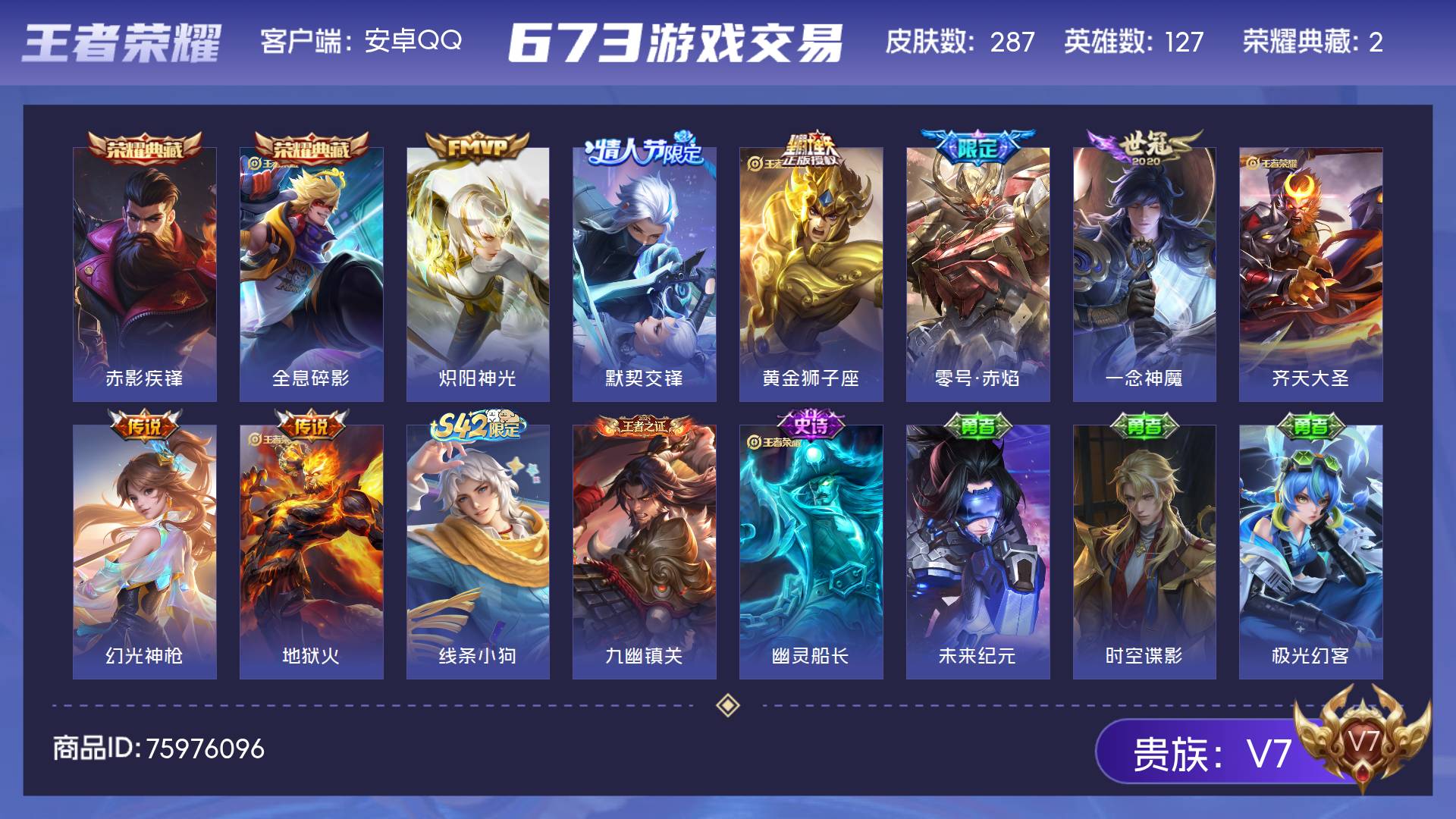 V7 皮肤287 英雄127 至尊星耀 荣耀典藏2 传说9 其他皮肤282