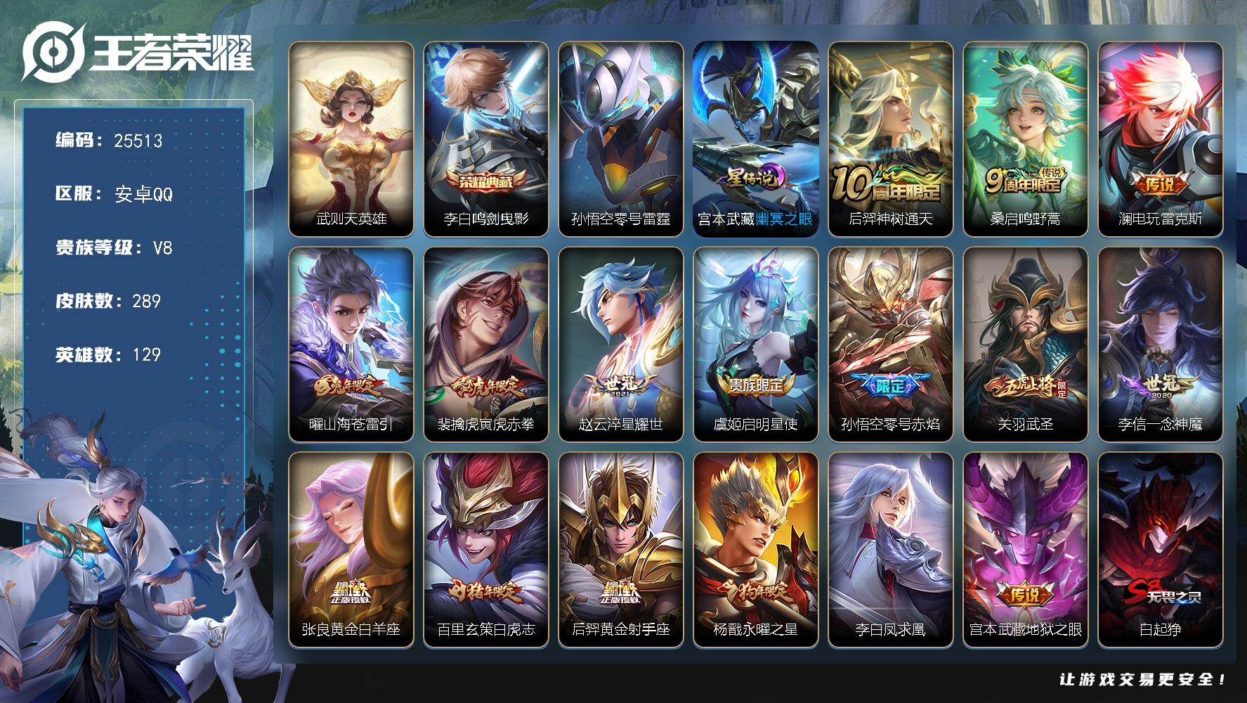 可换绑【店铺主推·李白双典藏含武则天英雄·虎年裴擒虎·零号赤焰·关羽武圣·白虎