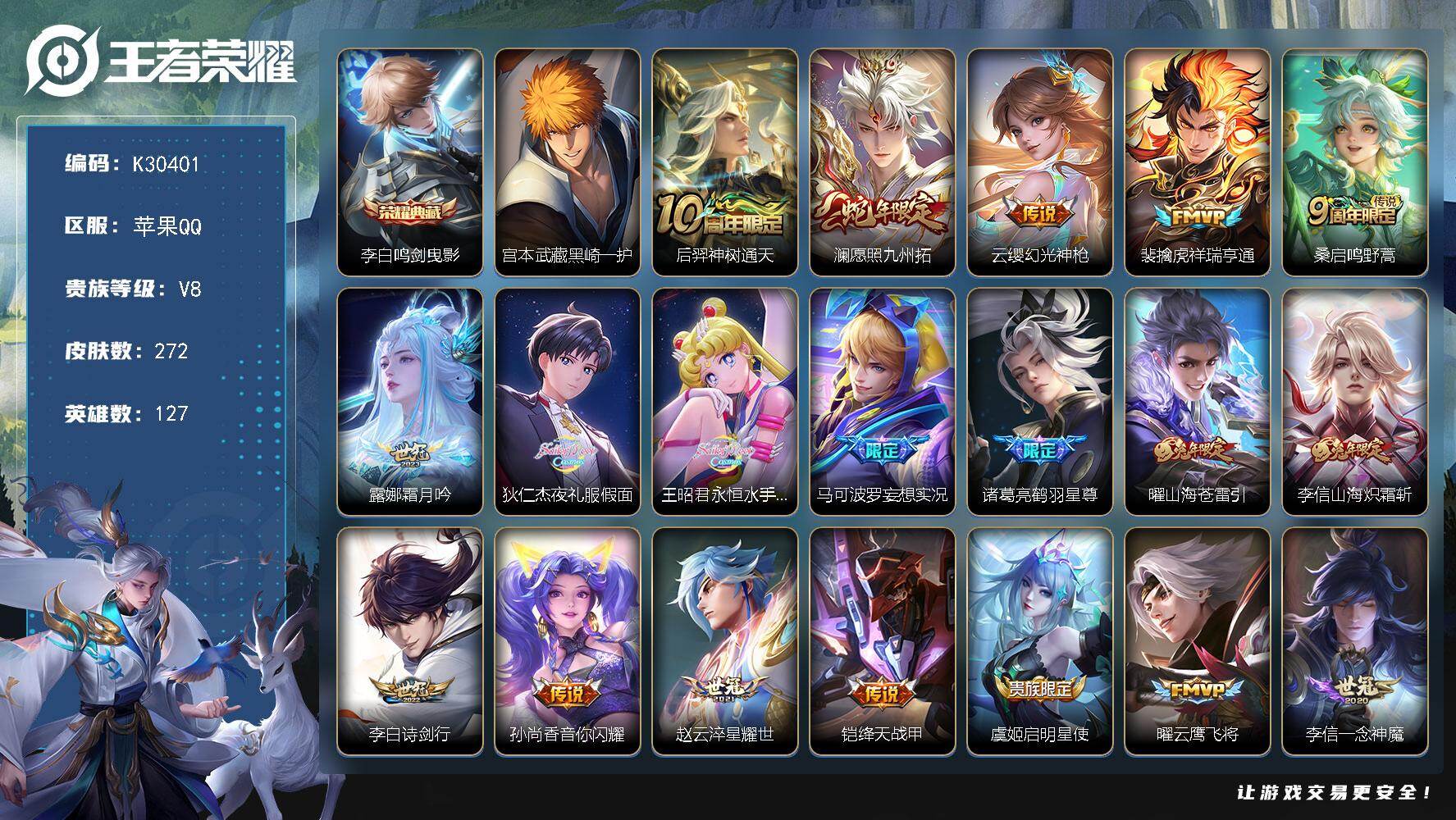 V8-至尊星耀IV段位-125英雄-235皮肤-1珍品传说-18传说-87史诗
