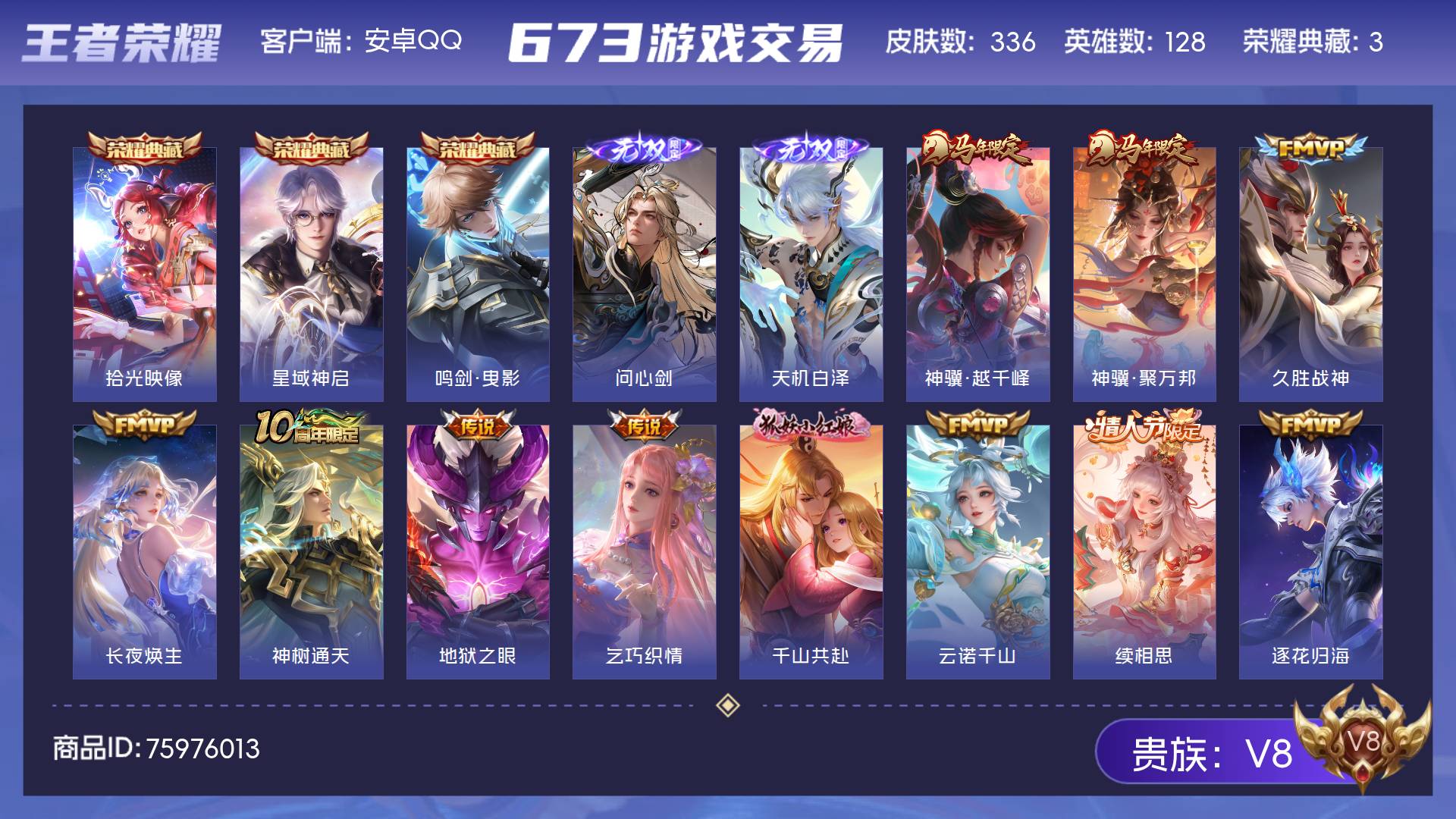 V8 皮肤336 英雄128 无双王者 荣耀典藏3 无双皮肤2 传说23 其他皮肤315