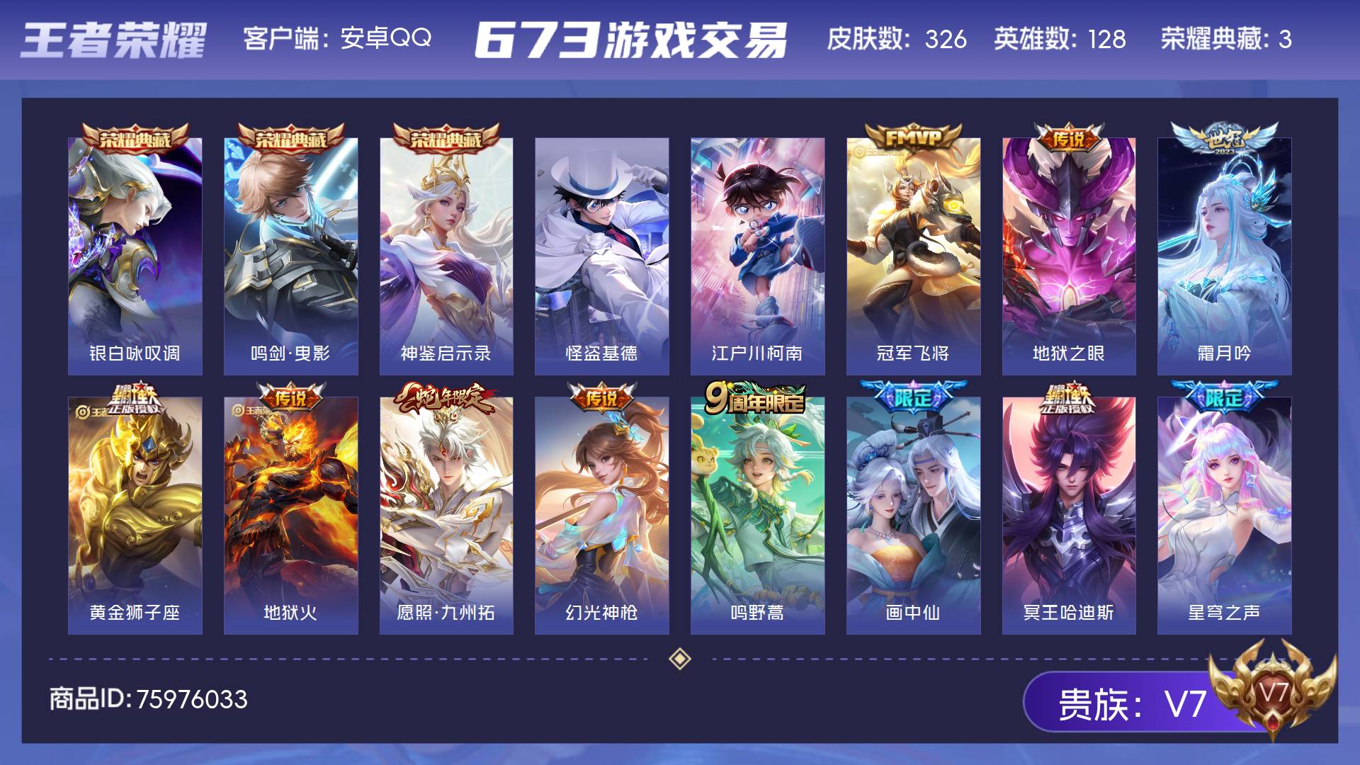 V7 皮肤326 英雄128 非凡王者 荣耀典藏3 珍品传说2 传说14 其他皮肤314