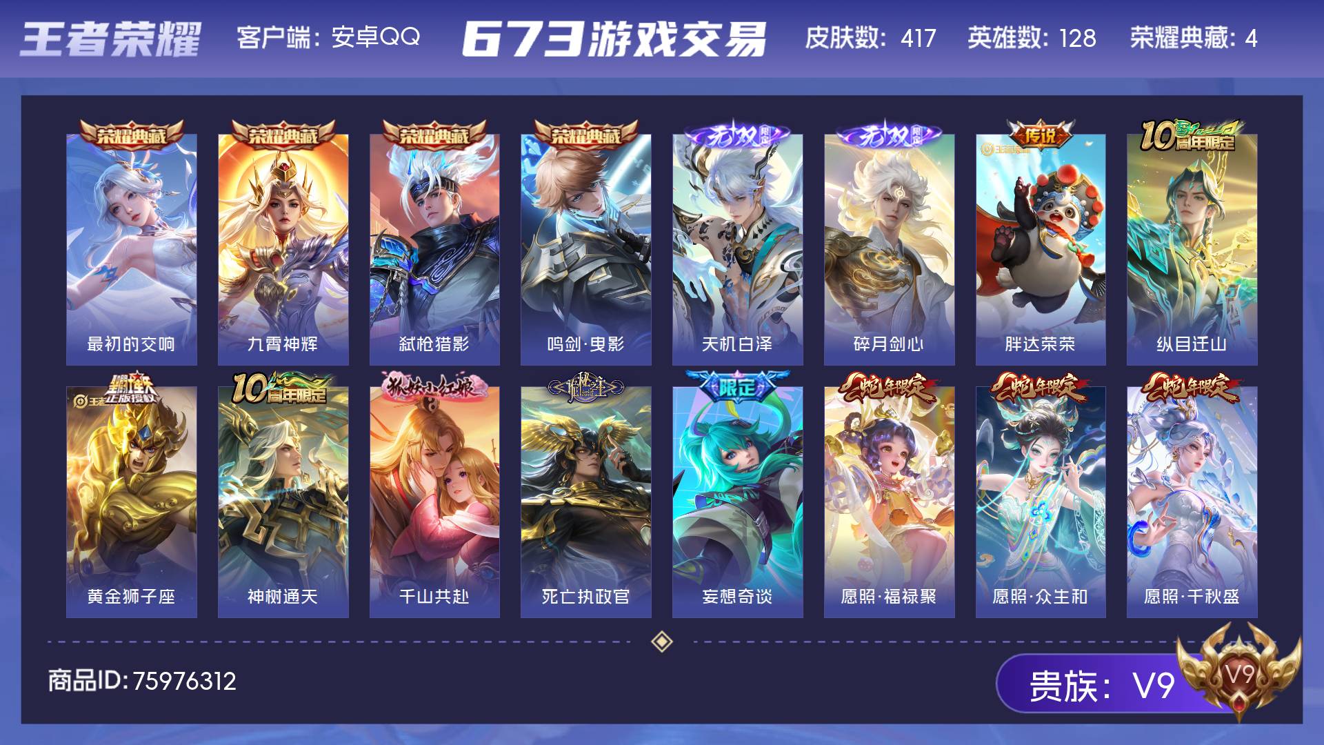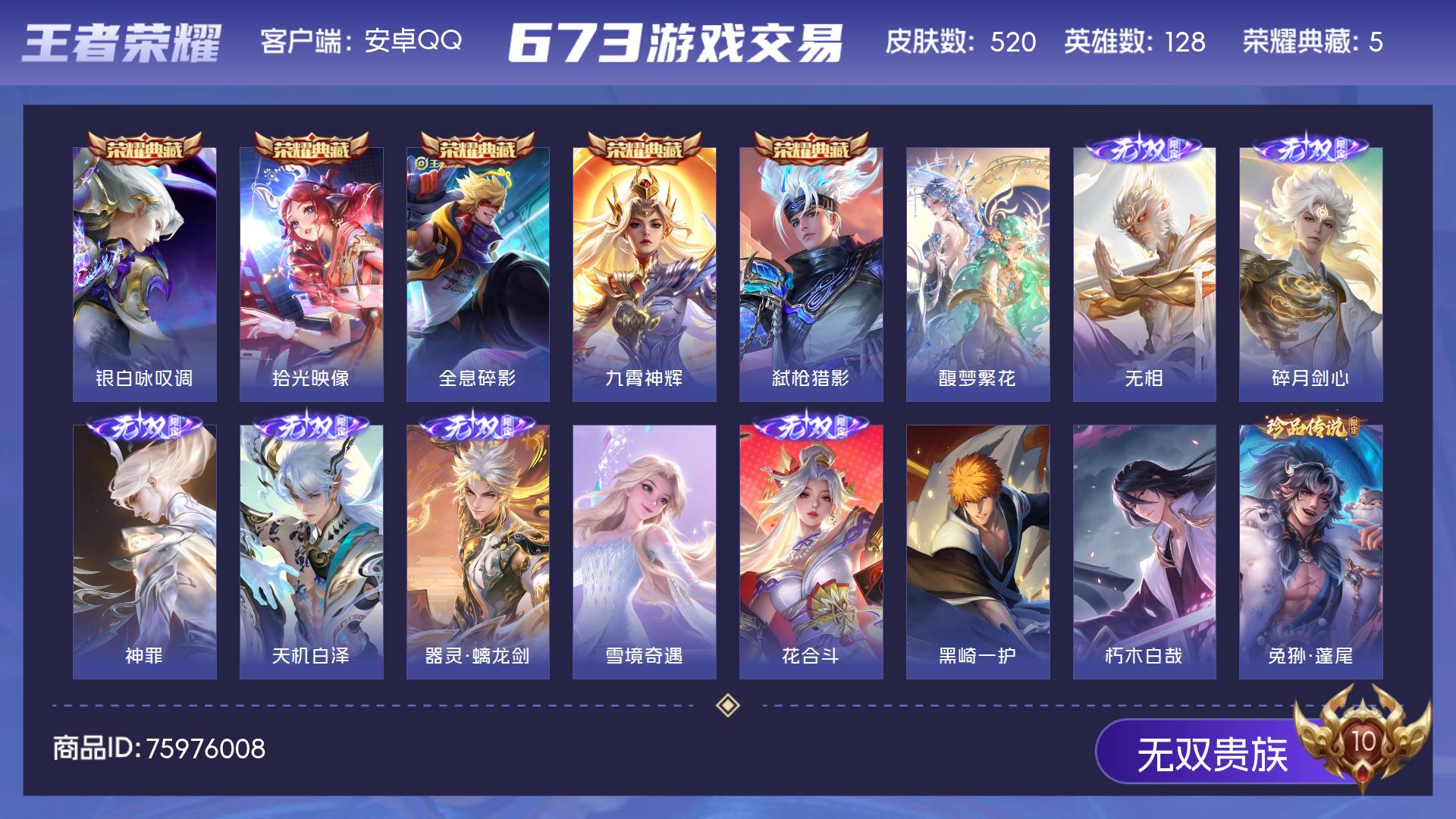 无双贵族 皮肤520 英雄128 至圣王者 荣耀典藏5 珍品无双1 无双皮肤7 珍品传说9 传说77 其他皮肤427