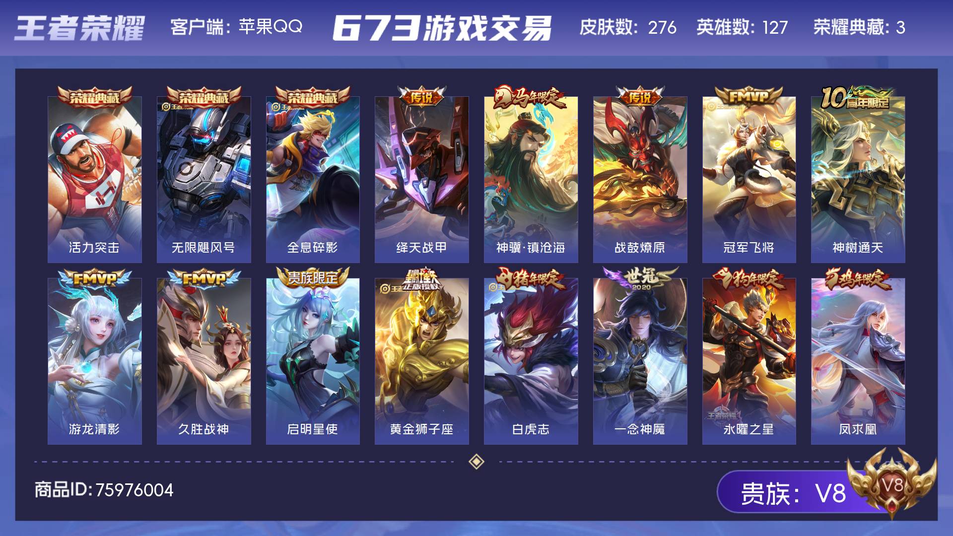 V8 皮肤276 英雄127 至尊星耀 荣耀典藏3 传说20 其他皮肤260