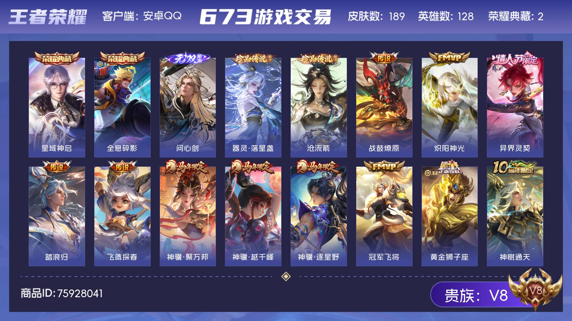 V8 皮肤189 英雄128 最强王者 荣耀典藏2 无双皮肤1 珍品传说2 传说23 其他皮肤168