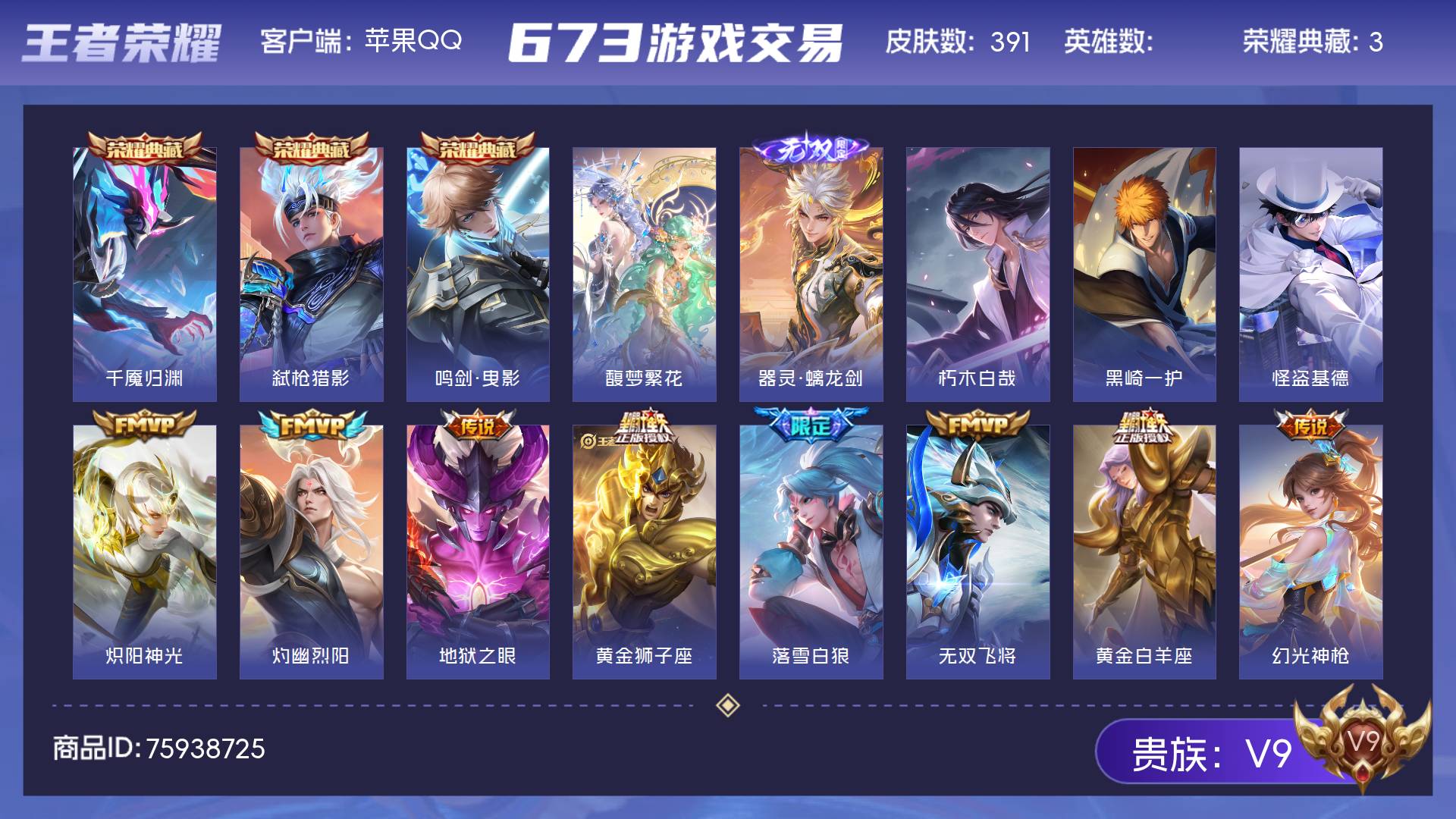 V9 皮肤391 至尊星耀 荣耀典藏3 珍品无双1 无双皮肤1 珍品传说3 传说32 其他皮肤358