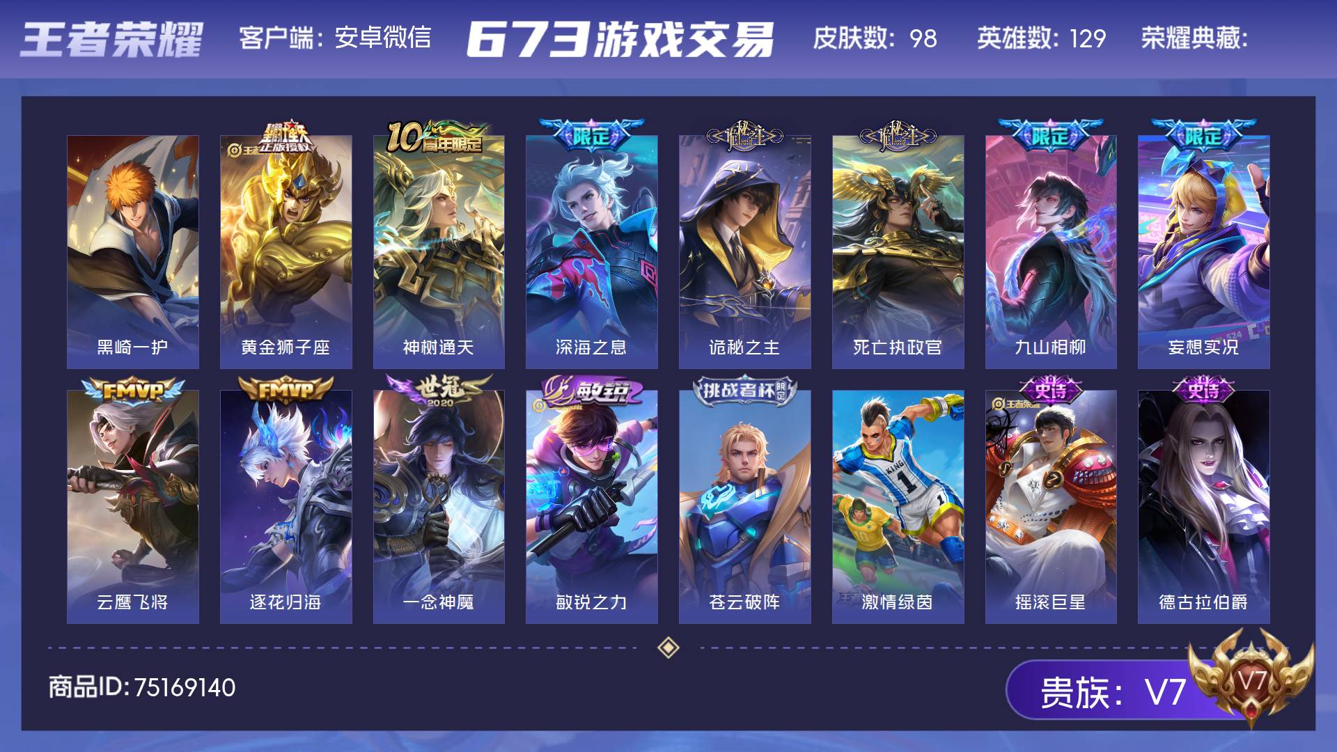 V7 皮肤98 英雄129 尊贵铂金 珍品传说1 传说10 其他皮肤90