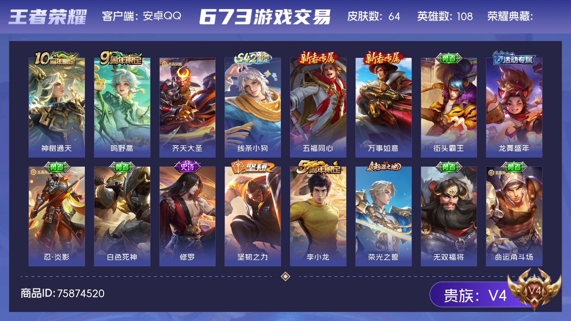 V4 皮肤64 英雄108 永恒钻石 传说3 其他皮肤67