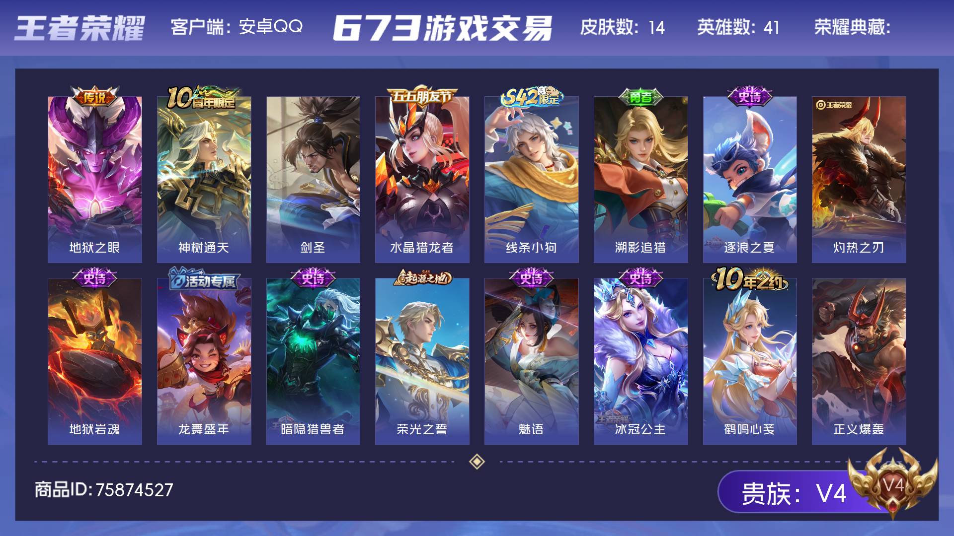 V4 皮肤14 英雄41 尊贵铂金 传说2 其他皮肤14