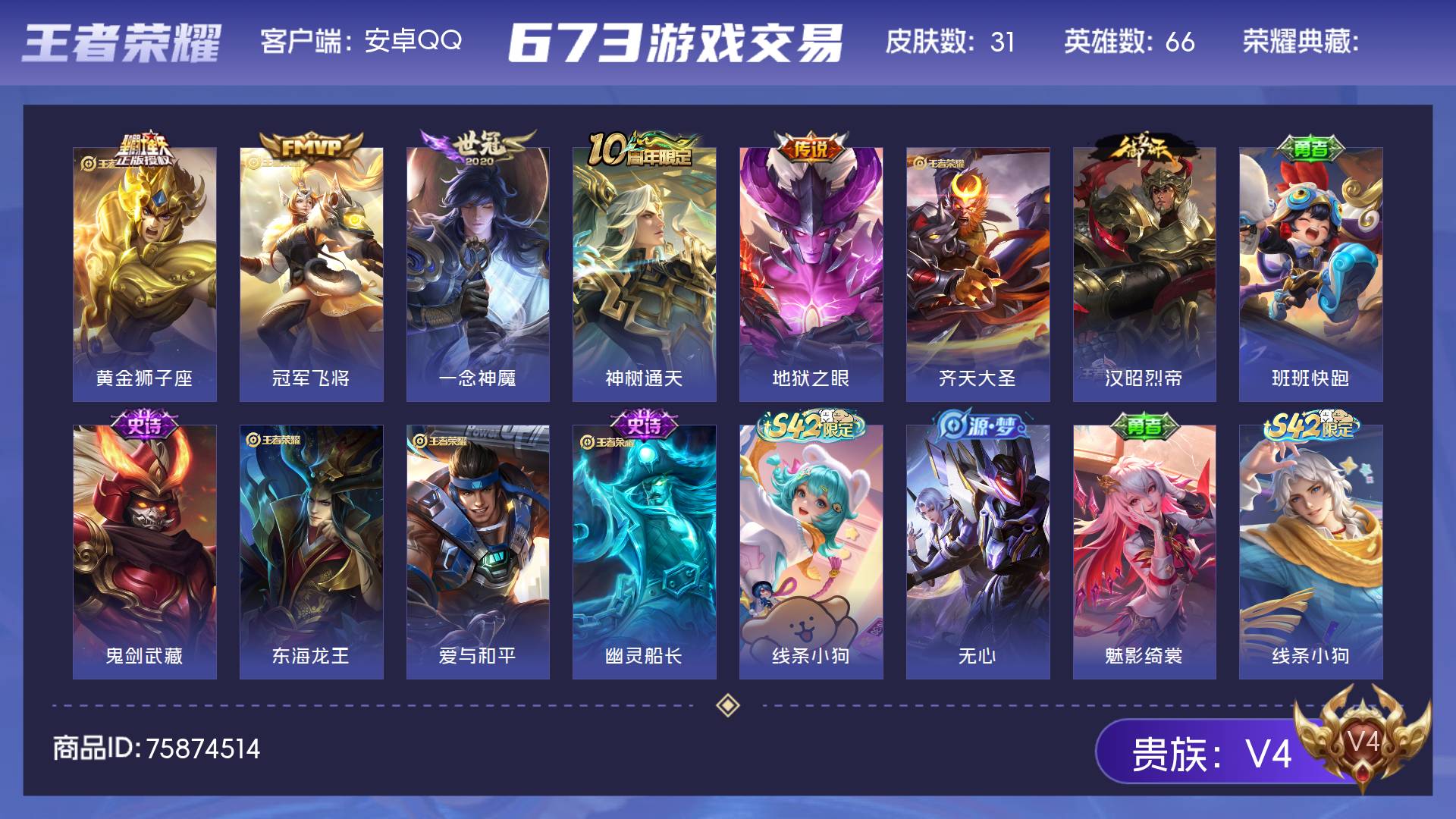 V4 皮肤31 英雄66 永恒钻石 传说6 其他皮肤29