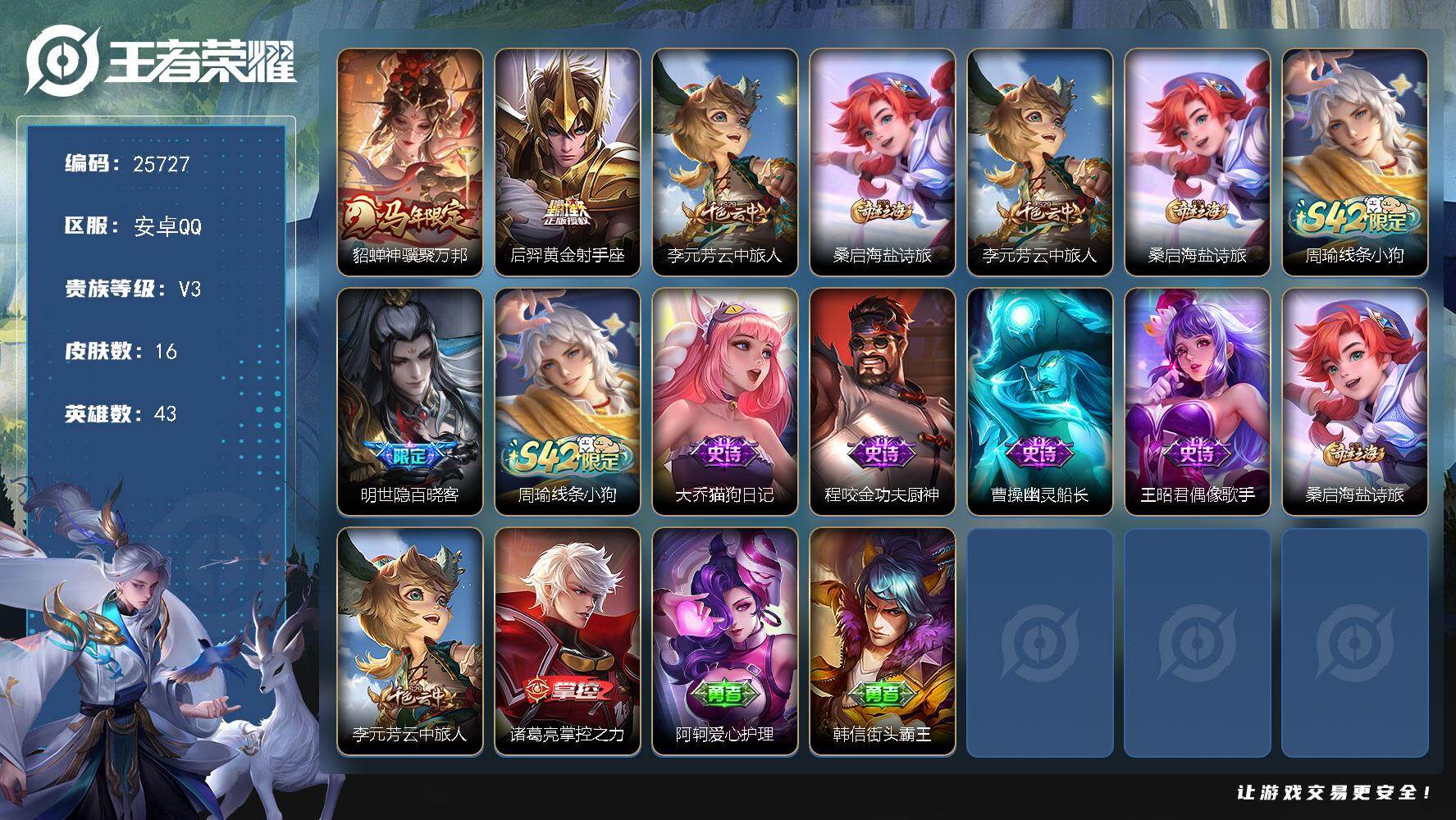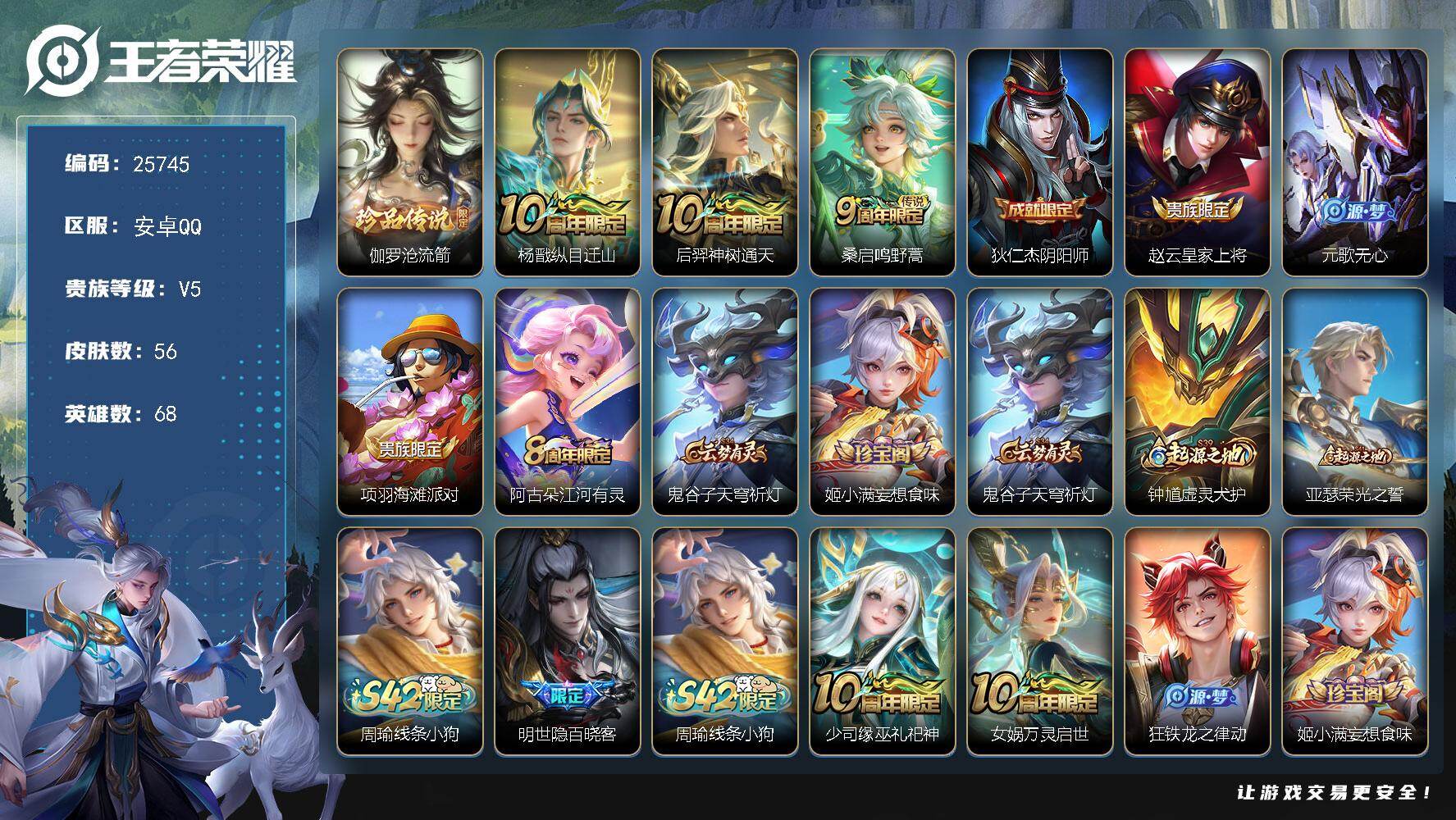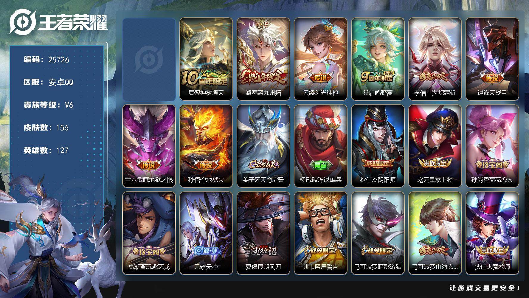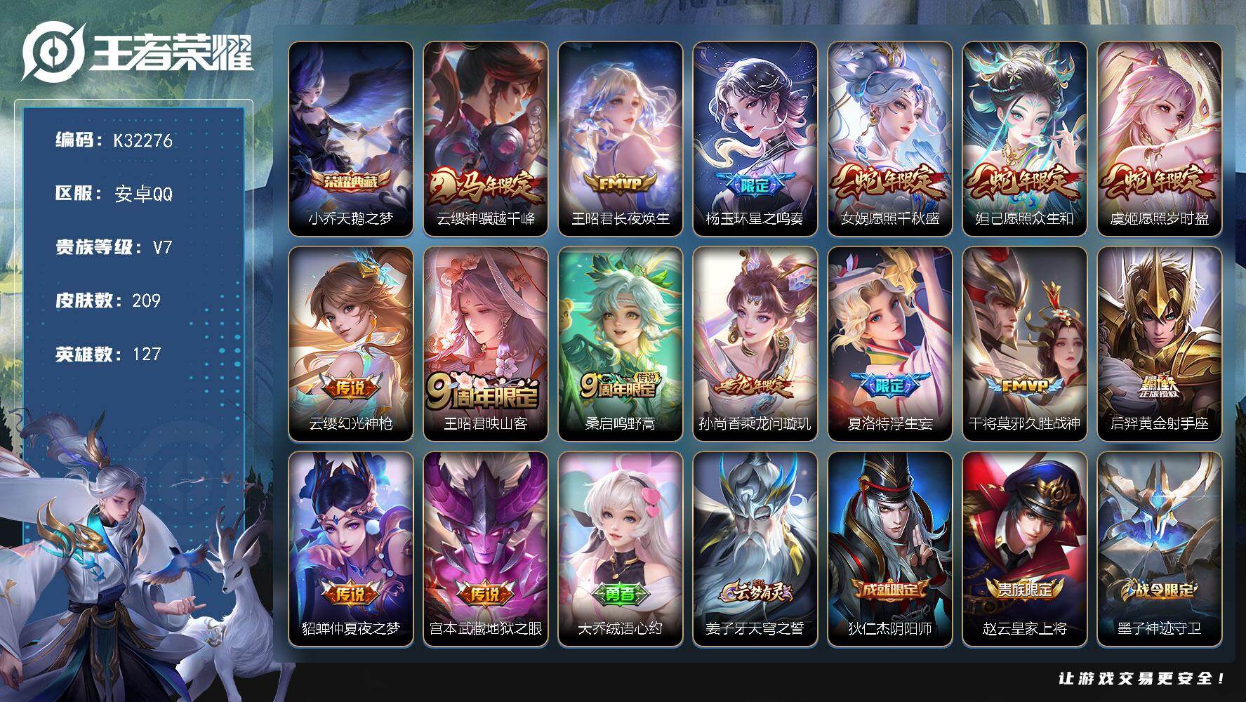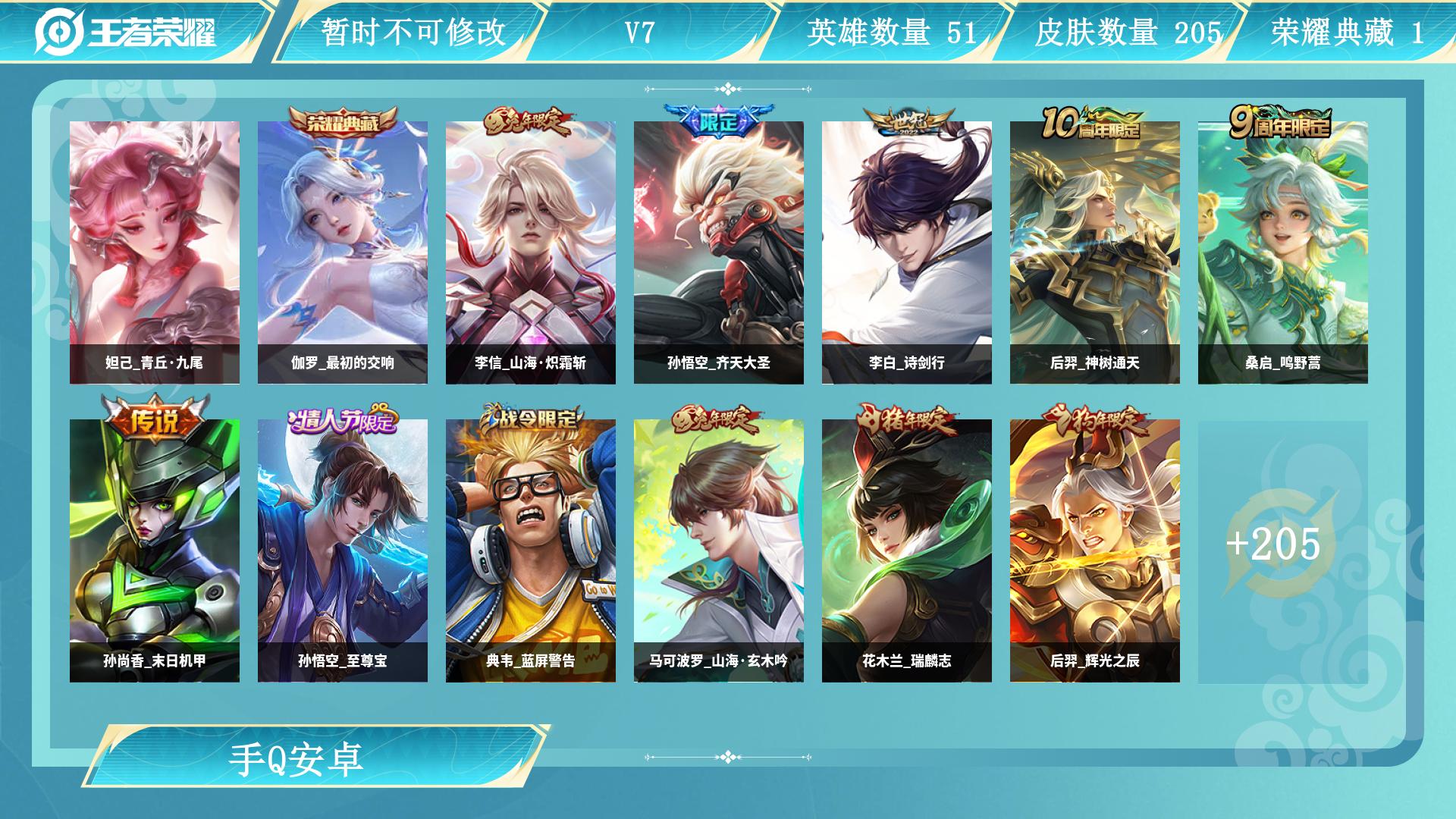 安卓Q-V7-最强王者段位-127英雄-209皮肤-1典藏皮肤-15传说-65史