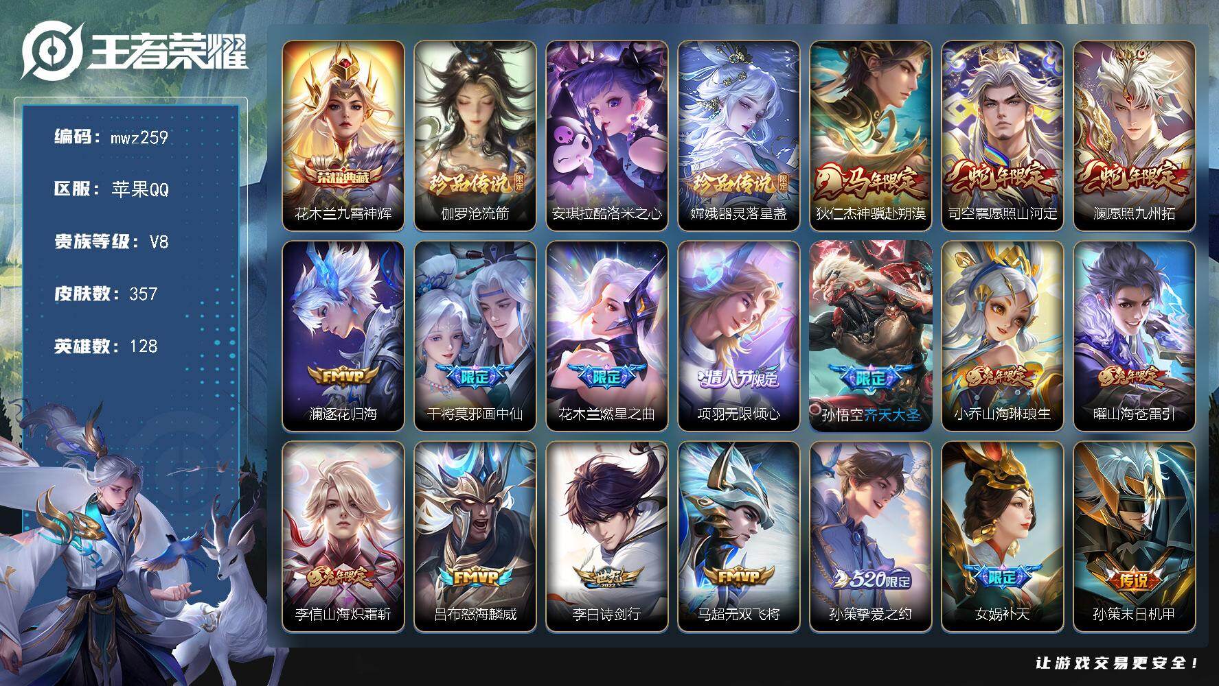【mwz259】苹果Q-V8-最强王者段位-128英雄-357皮肤-1典藏皮肤