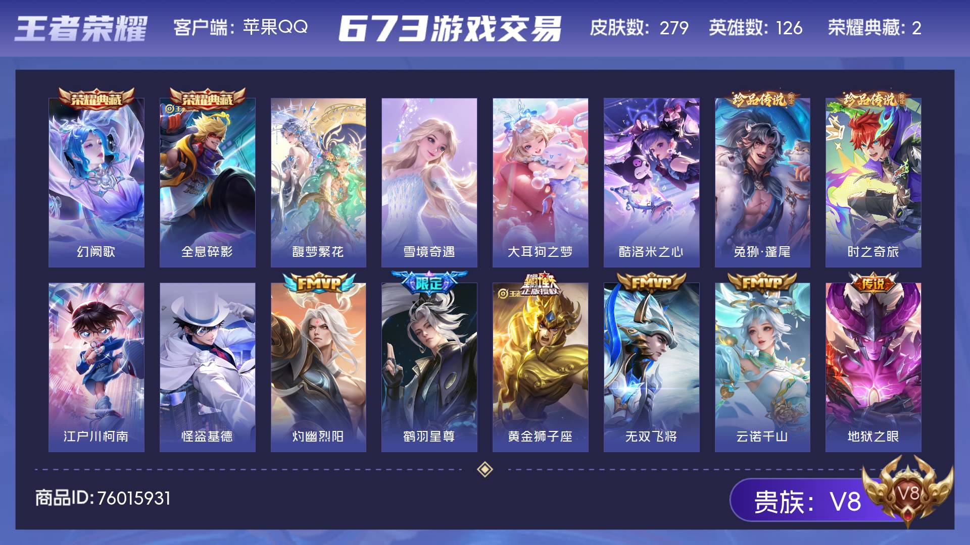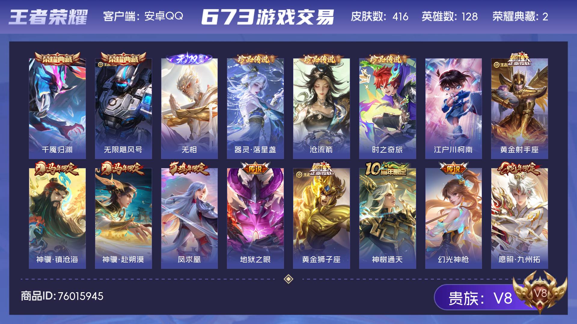 V8 1典藏 7传说 128英雄 270皮肤 典藏英雄武则天