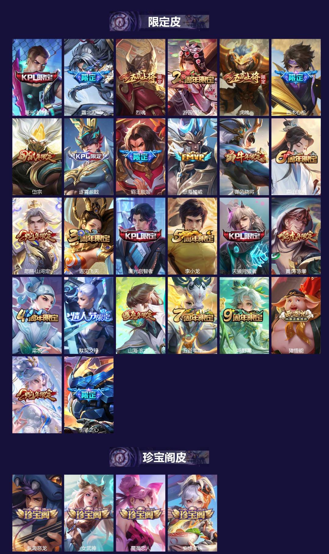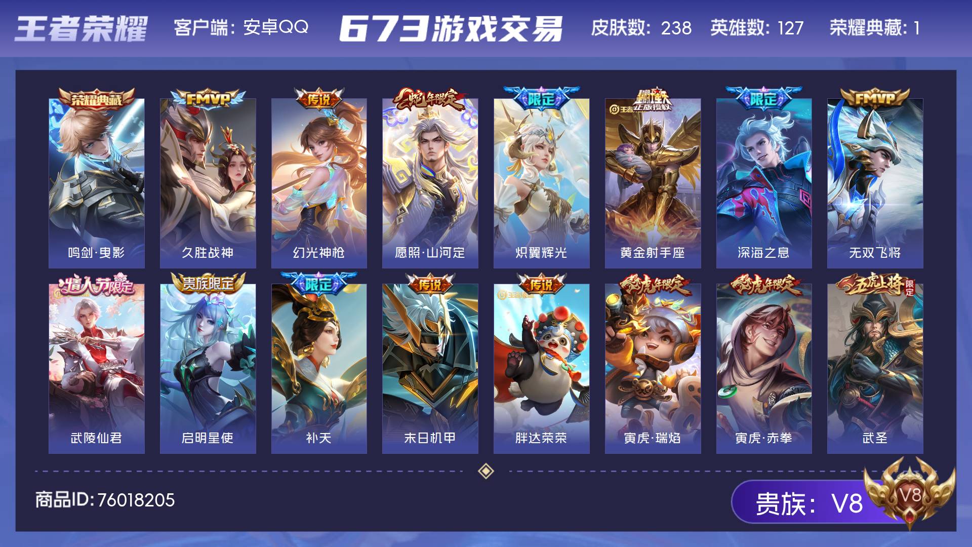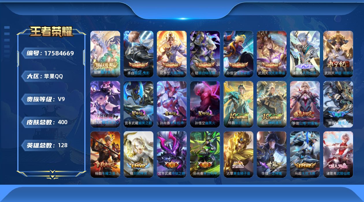 V8 皮肤238 英雄127 至尊星耀 荣耀典藏1 传说24 其他皮肤220