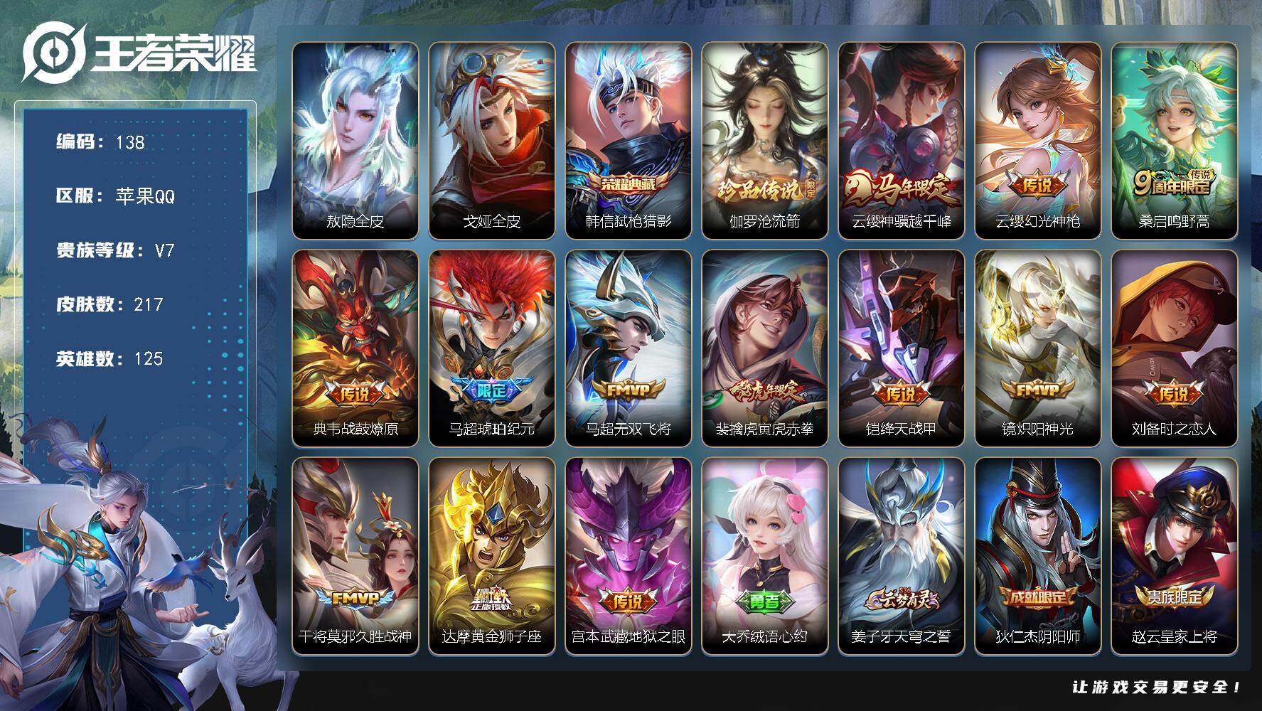 V7 12传说 125英雄 221皮肤 可修改实名 男号