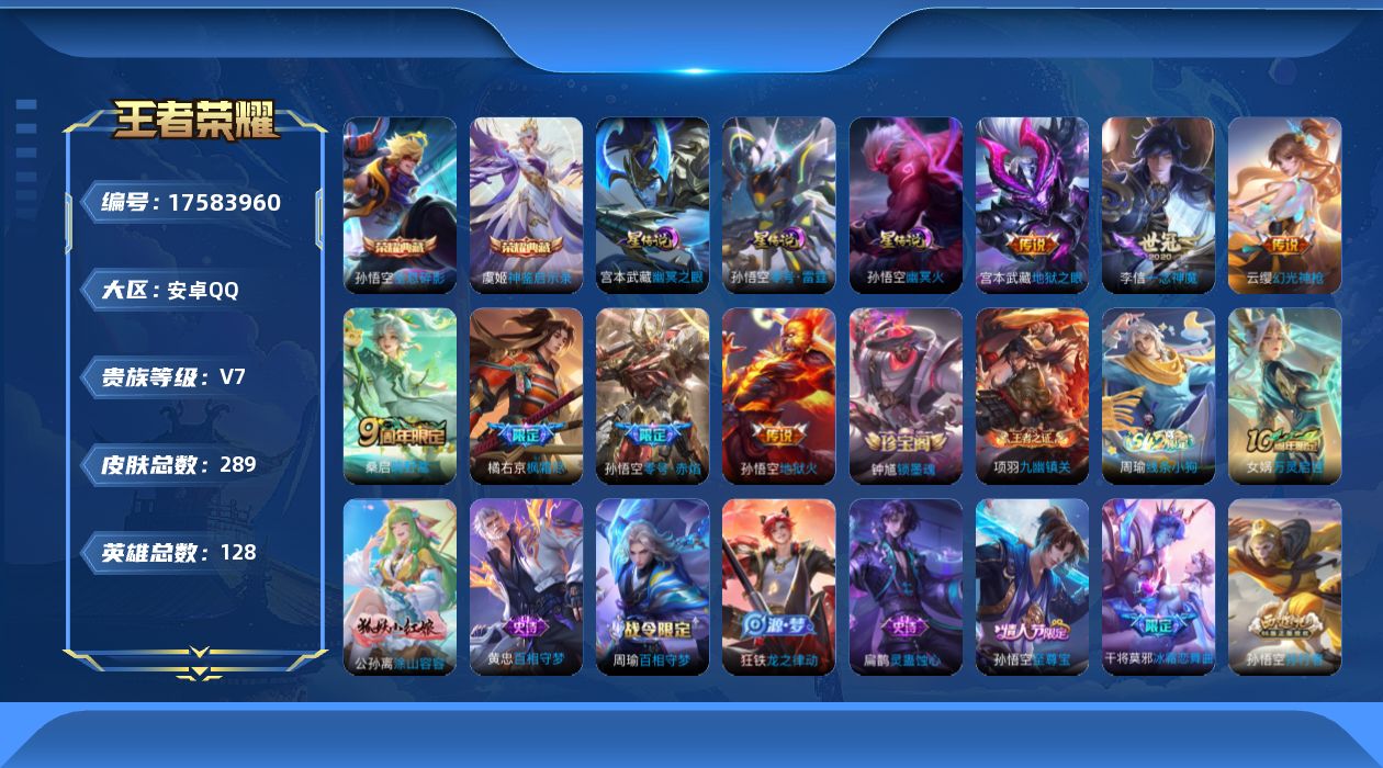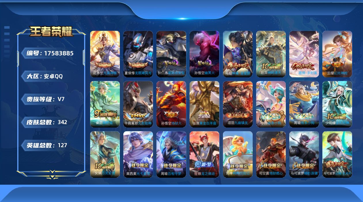V7 9传说 127英雄 211皮肤 可修改实名 男号