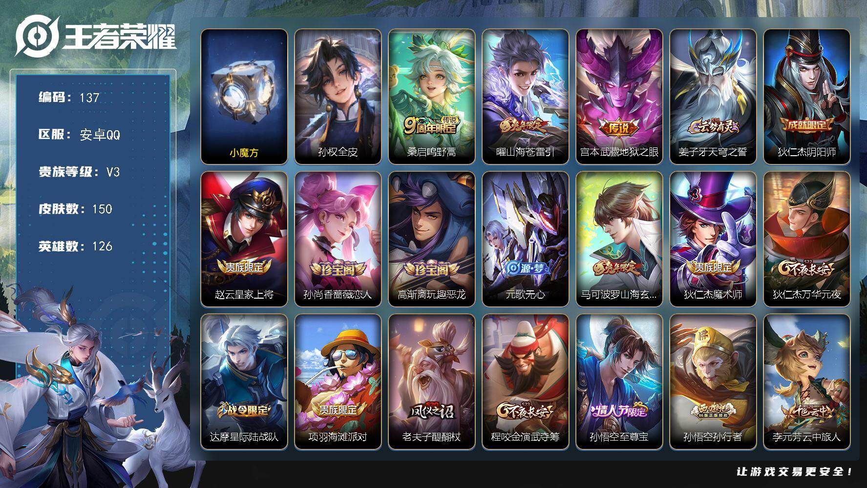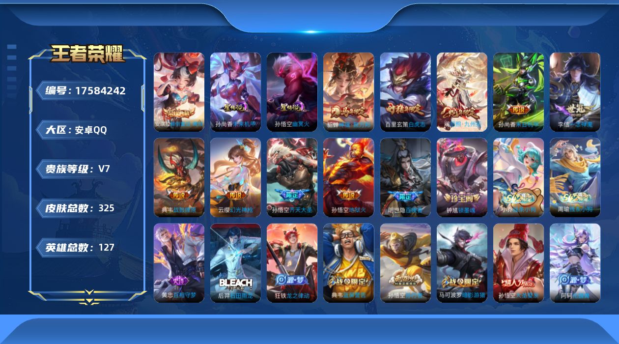 V7 1典藏 5传说 126英雄 175皮肤 可修改实名 男