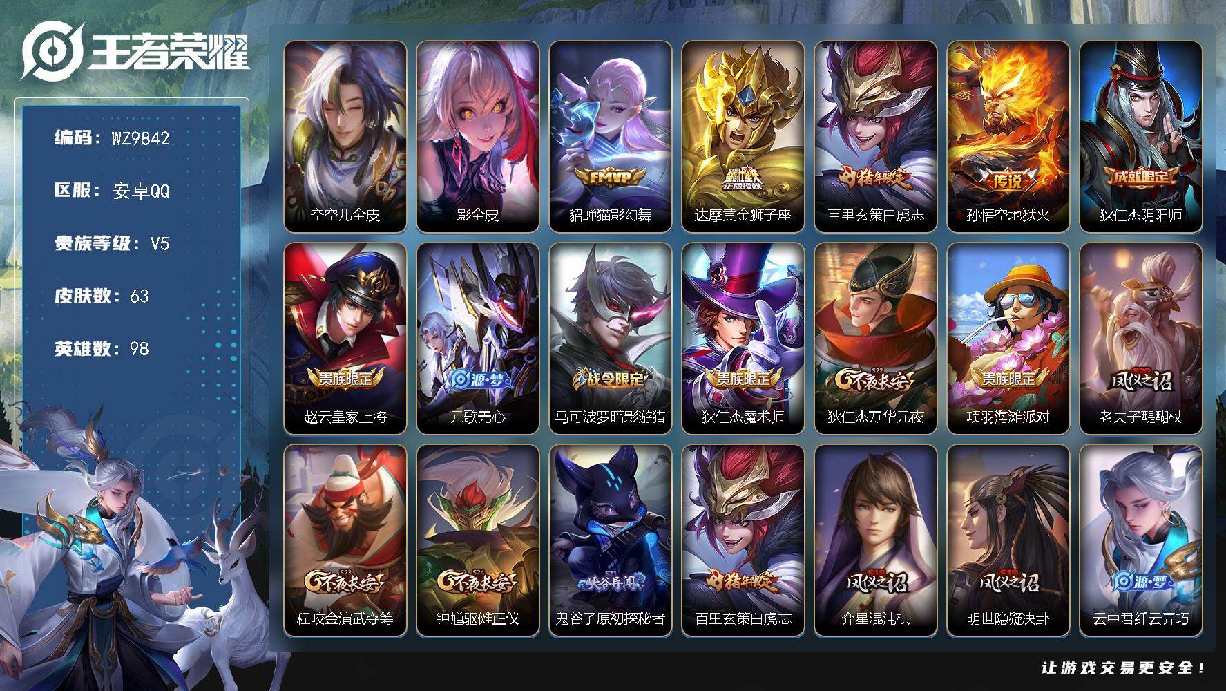 安卓Q-V5-最强王者段位-98英雄-63皮肤-4传说-15史诗【英雄全皮】