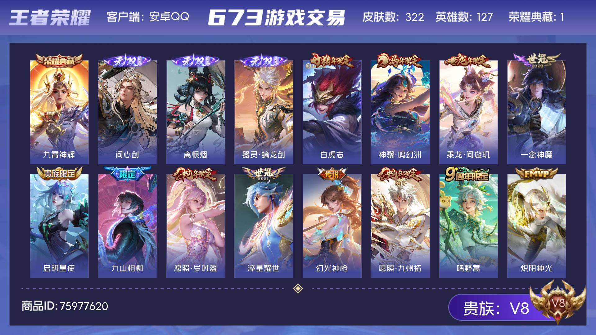 V8 皮肤322 英雄127 至尊星耀 荣耀典藏1 无双皮肤3 传说18 其他皮肤307