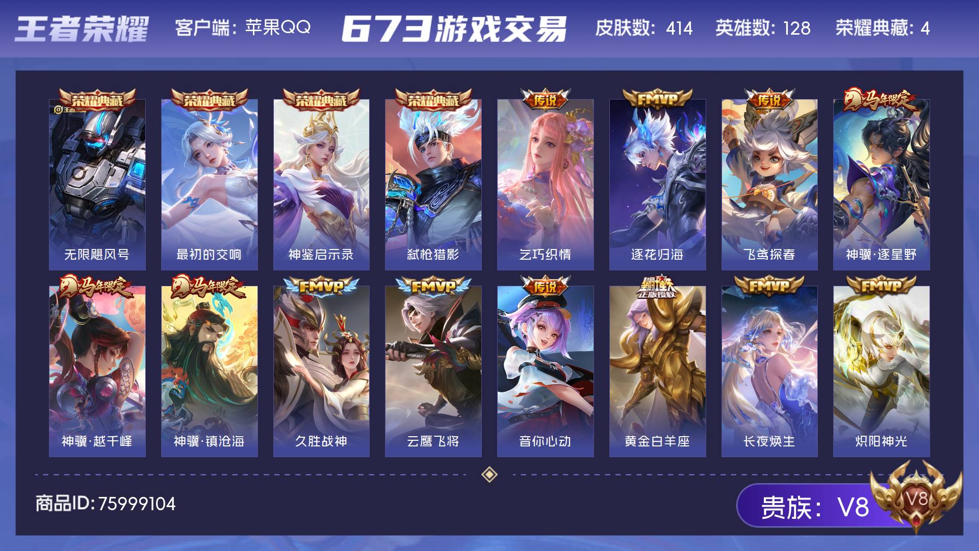 V8 皮肤414 英雄128 非凡王者 荣耀典藏4 传说27 其他皮肤389