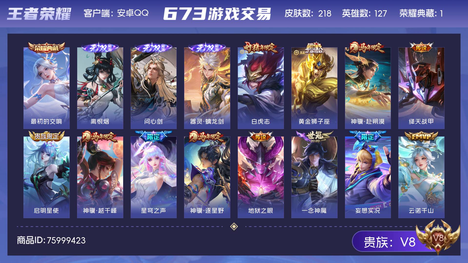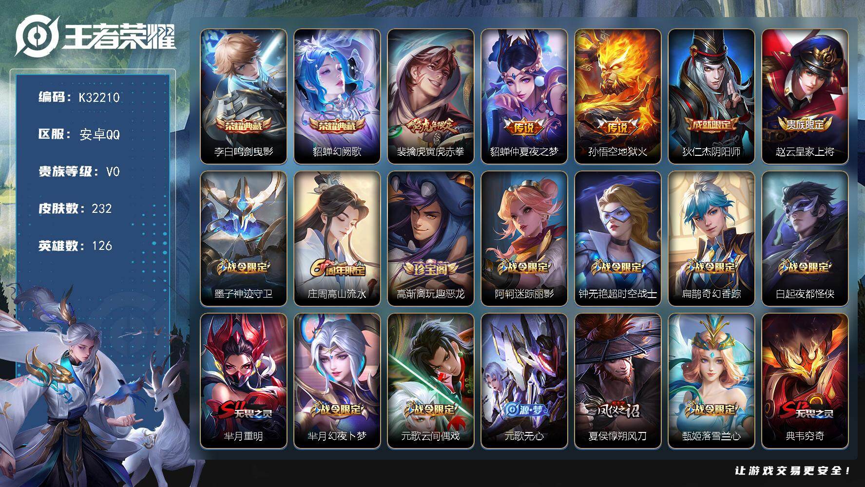安卓QQ/V7/最强王者/225皮肤/125英雄/1典藏/0珍品无双/2无双/