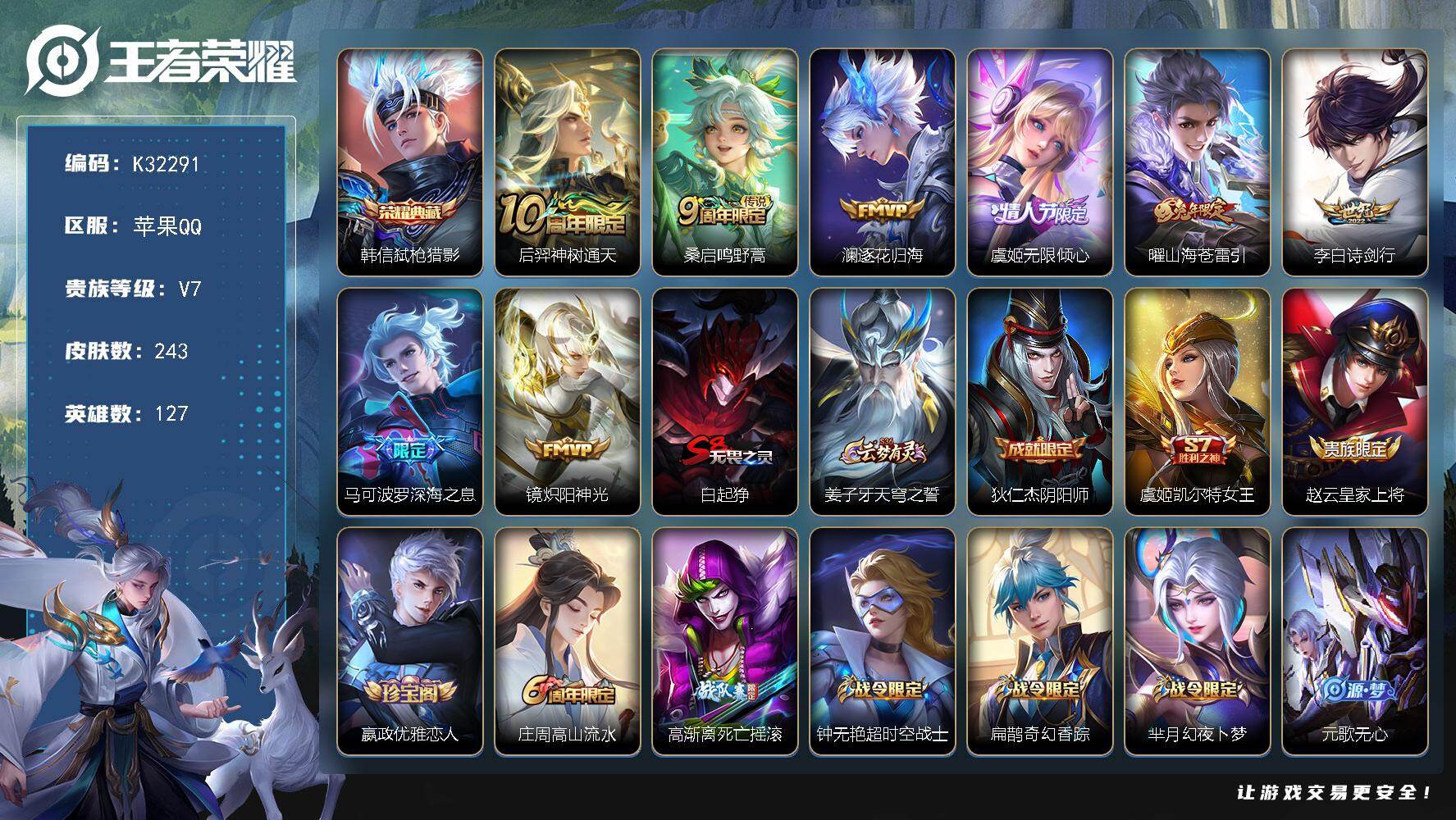 苹果Q-V7-最强王者段位-127英雄-243皮肤-1典藏皮肤-8传说-60史诗