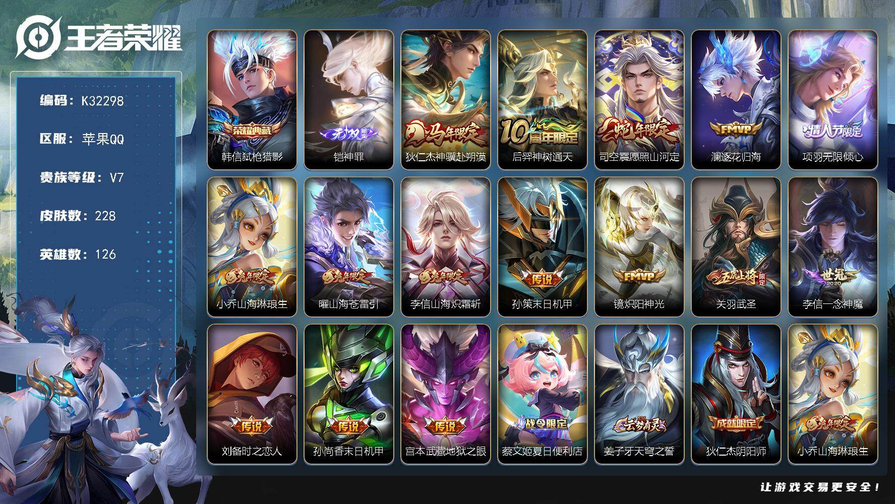 苹果Q-V7-最强王者段位-126英雄-228皮肤-1典藏皮肤-1无双-15传说