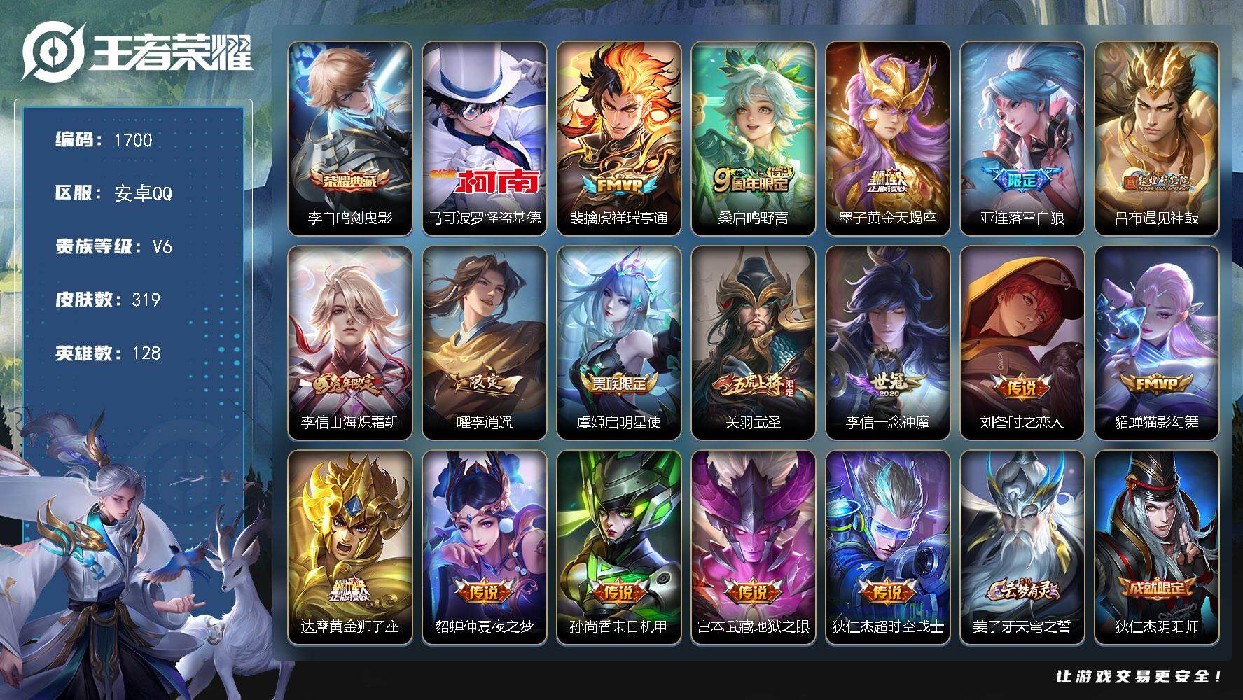 安卓Q-V6-至尊星耀I段位-128英雄-319皮肤-1典藏皮肤-1珍品传说-