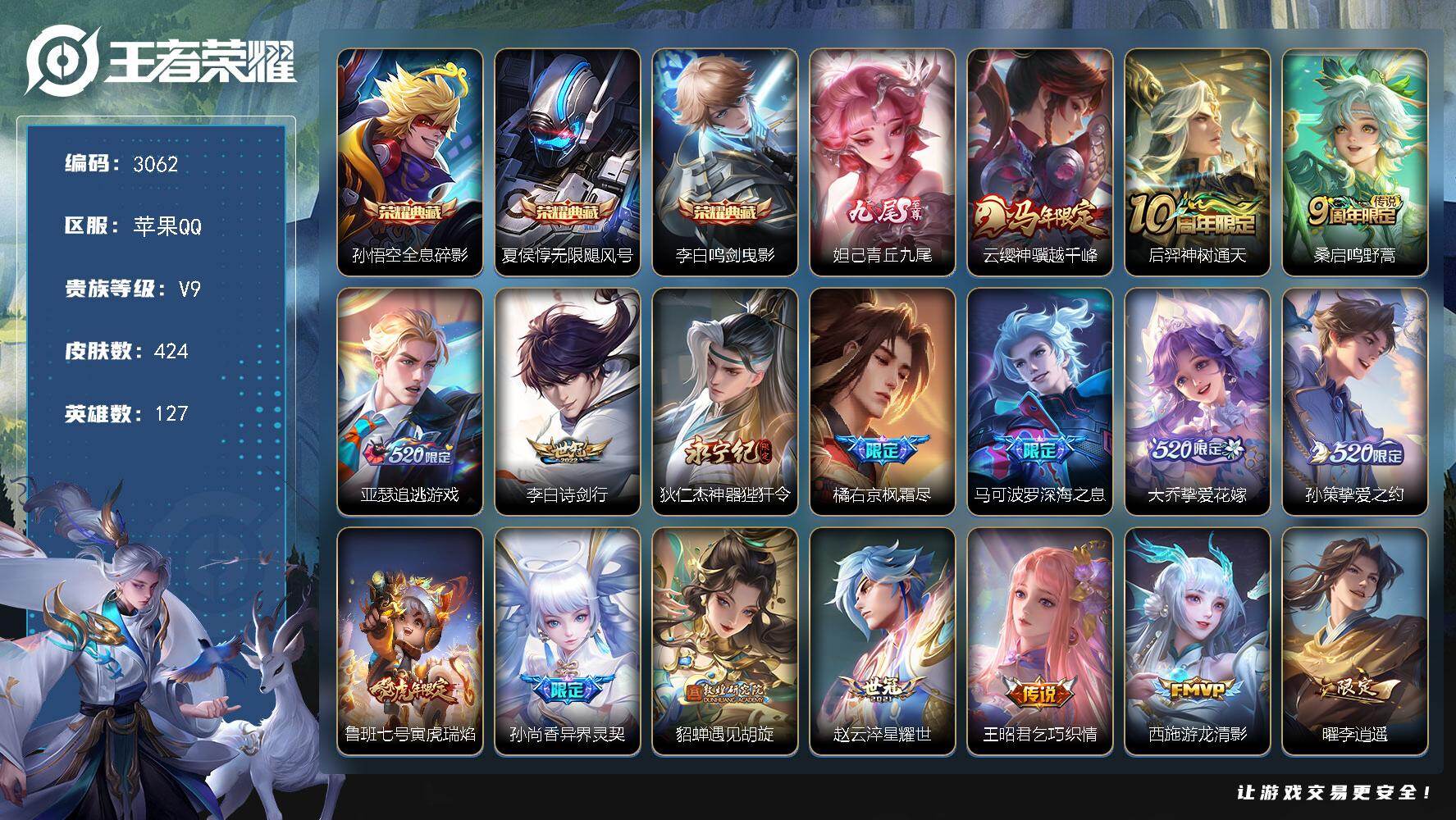 苹果Q-V9-至尊星耀II段位-127英雄-424皮肤-3典藏皮肤-1无双-3