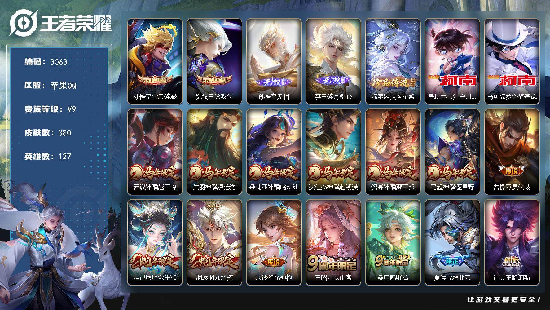苹果Q-V9-最强王者段位-127英雄-380皮肤-2典藏皮肤-2无双-3珍品