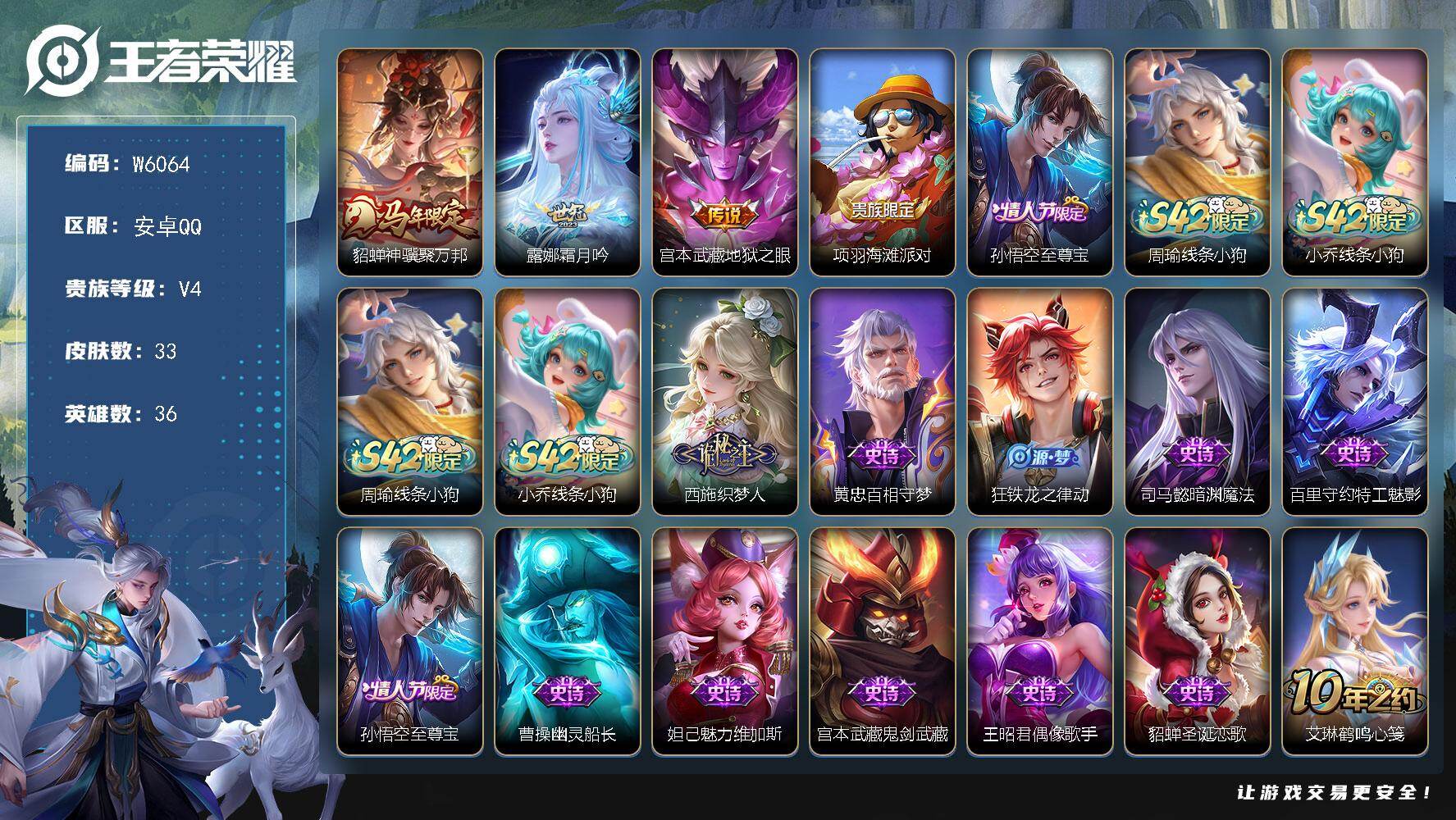 贵4-36英雄-33皮肤-3传说-10限定-4按键-贵族积分3933