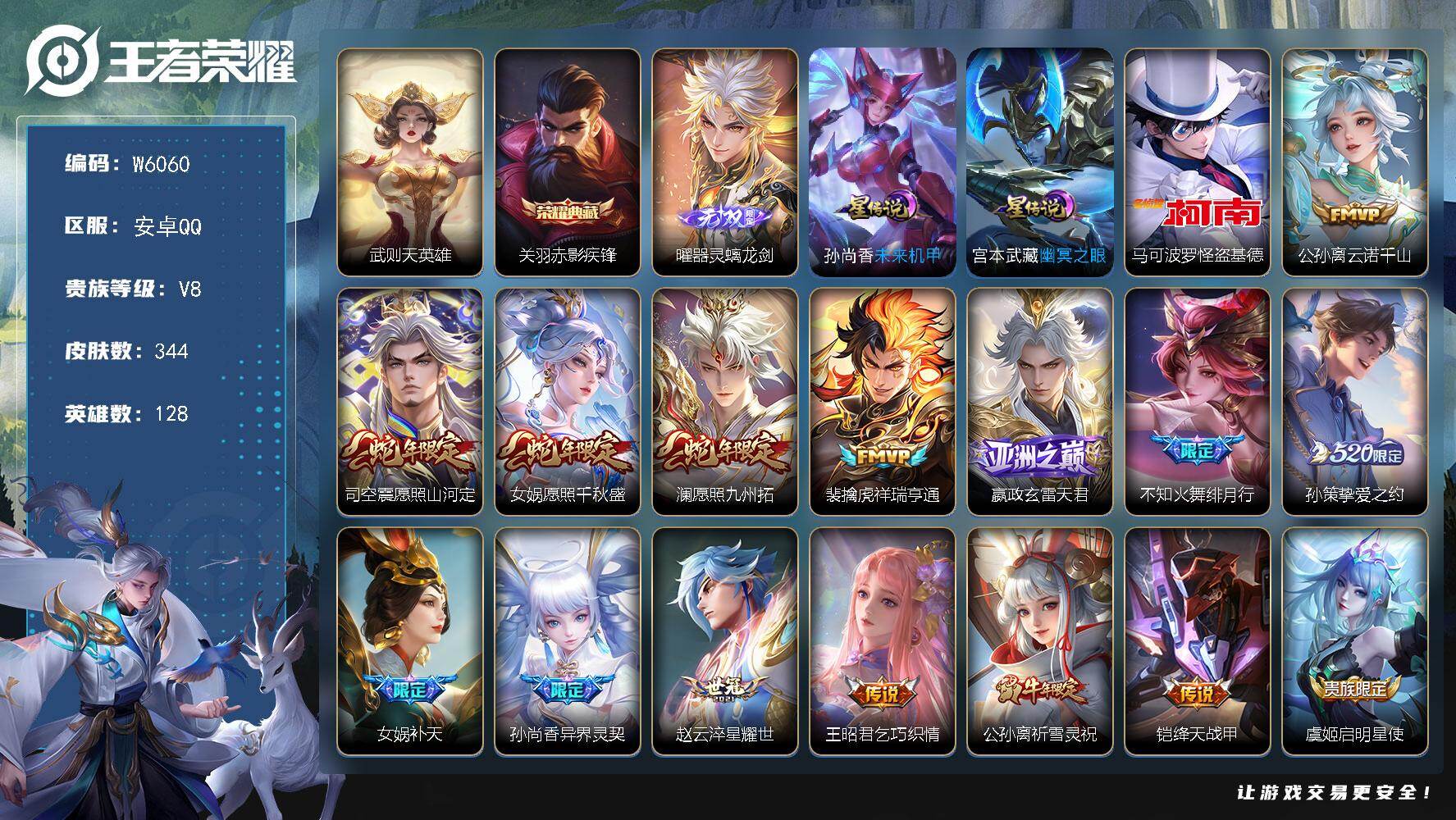 贵8-128英雄-344皮肤-2典藏-1无双-1珍品传说-2星元-27传说-134限定-7个性按键.贵族积分8.7万
