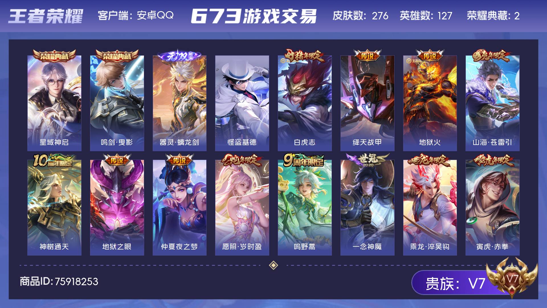 V7-最强王者段位-127英雄-270皮肤-1典藏皮肤-1珍品传说