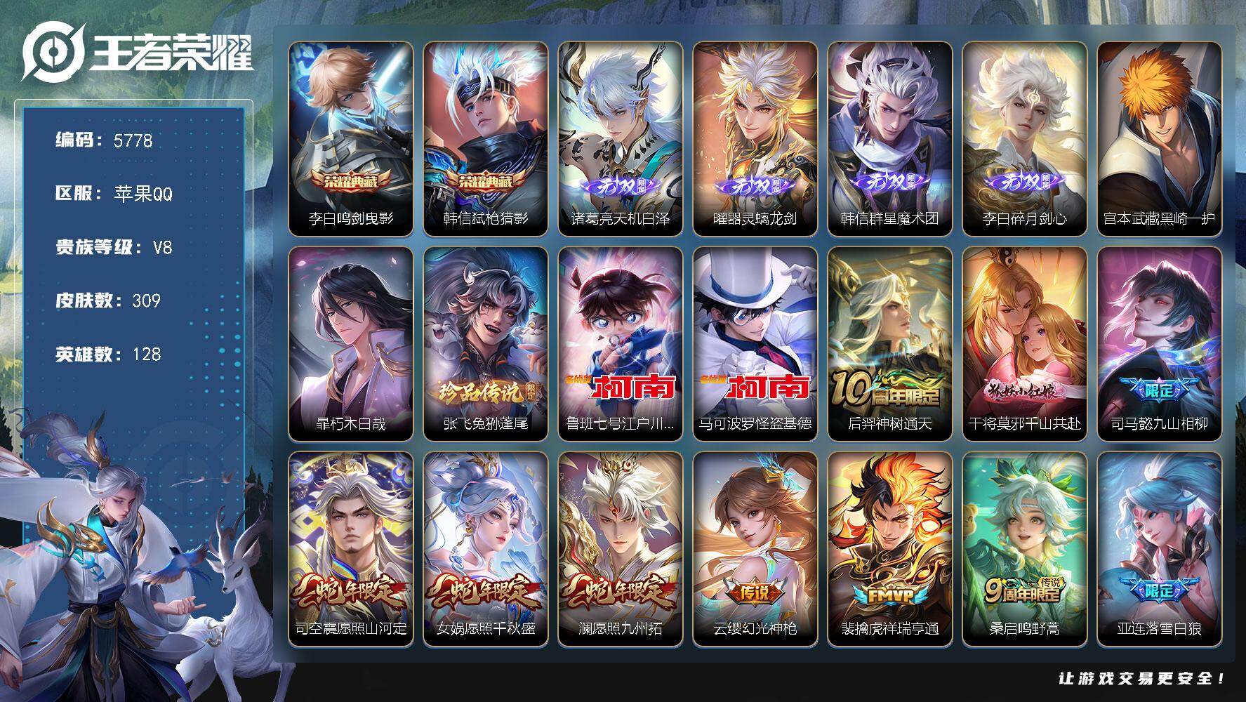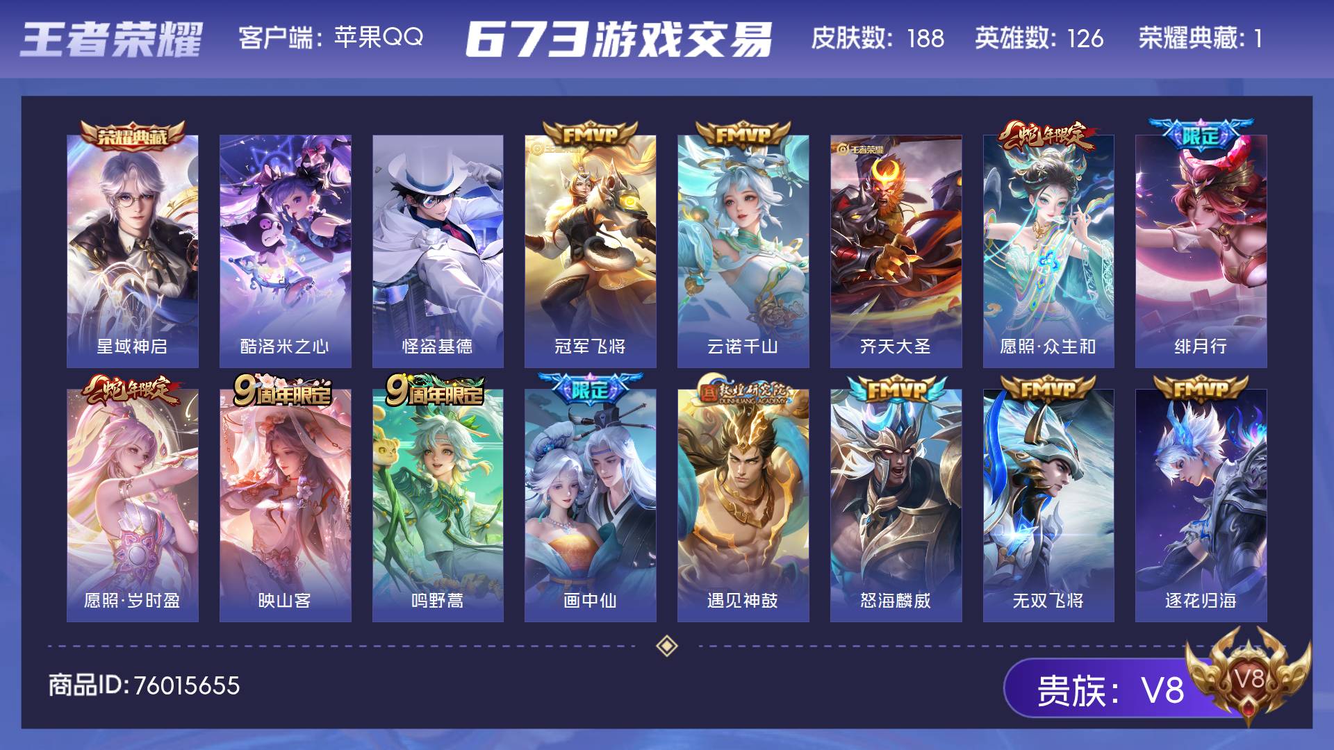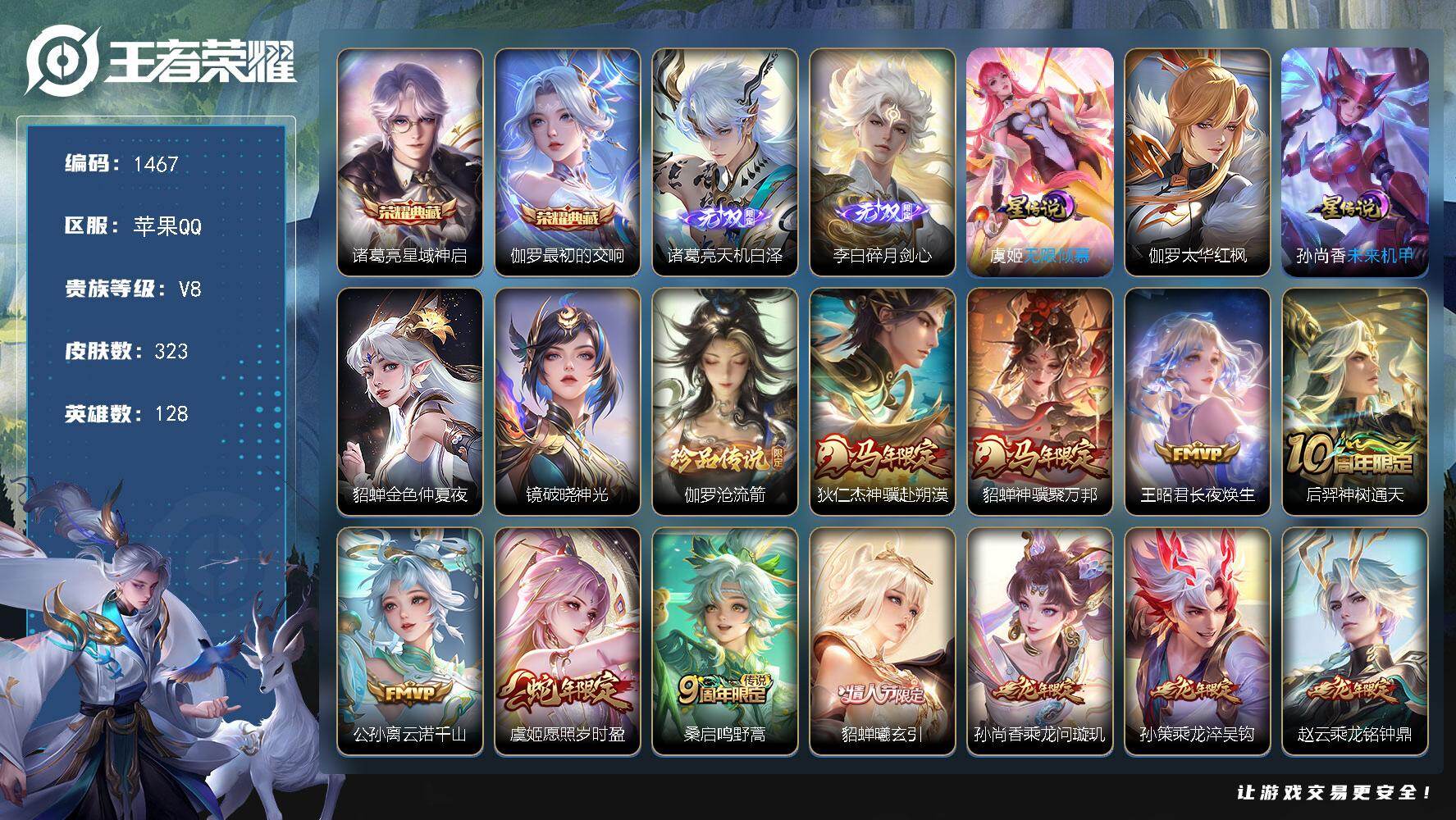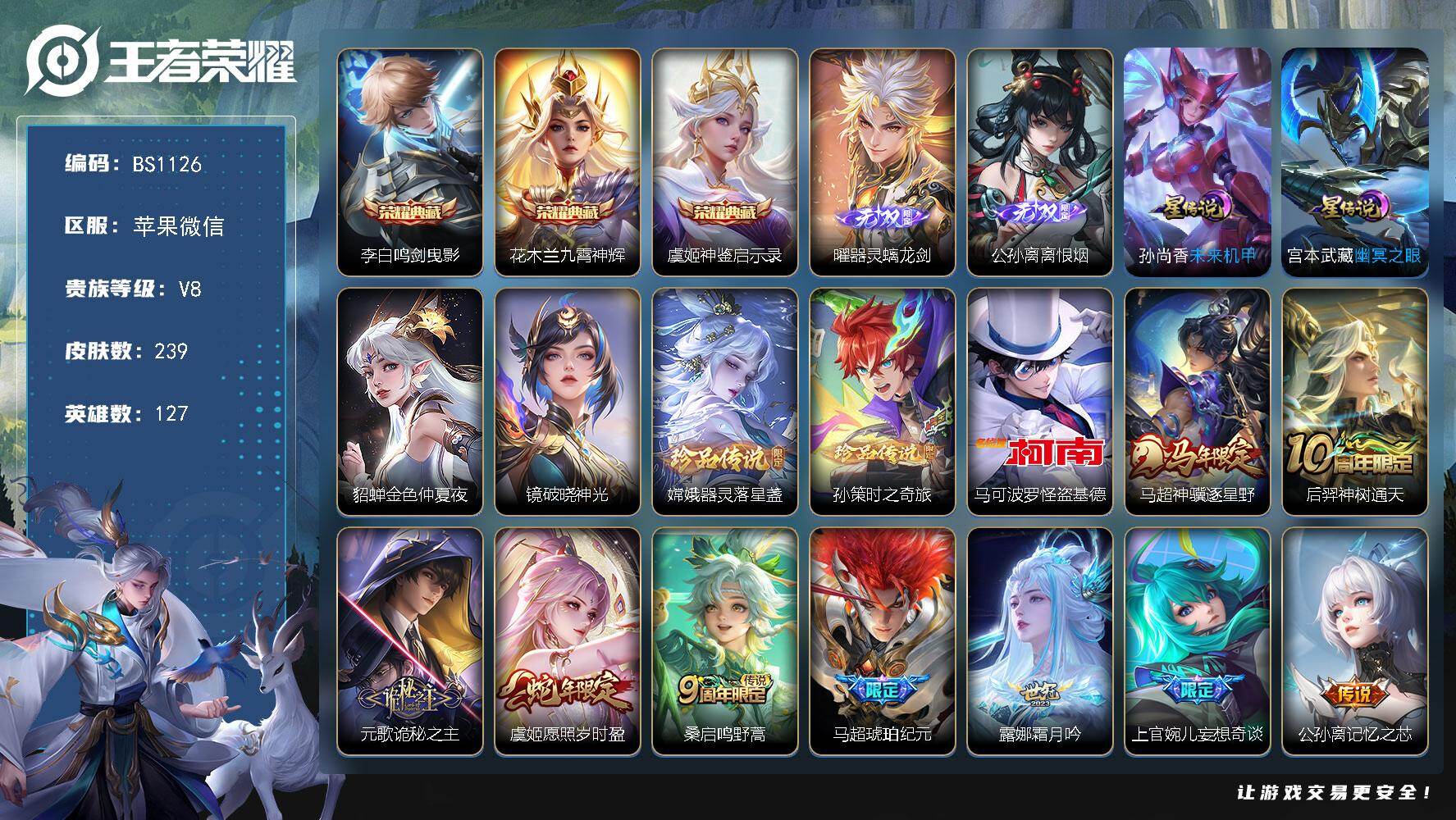 苹果Q-V8-至尊星耀II段位-127英雄-249皮肤-1典藏皮肤-2无双-3珍