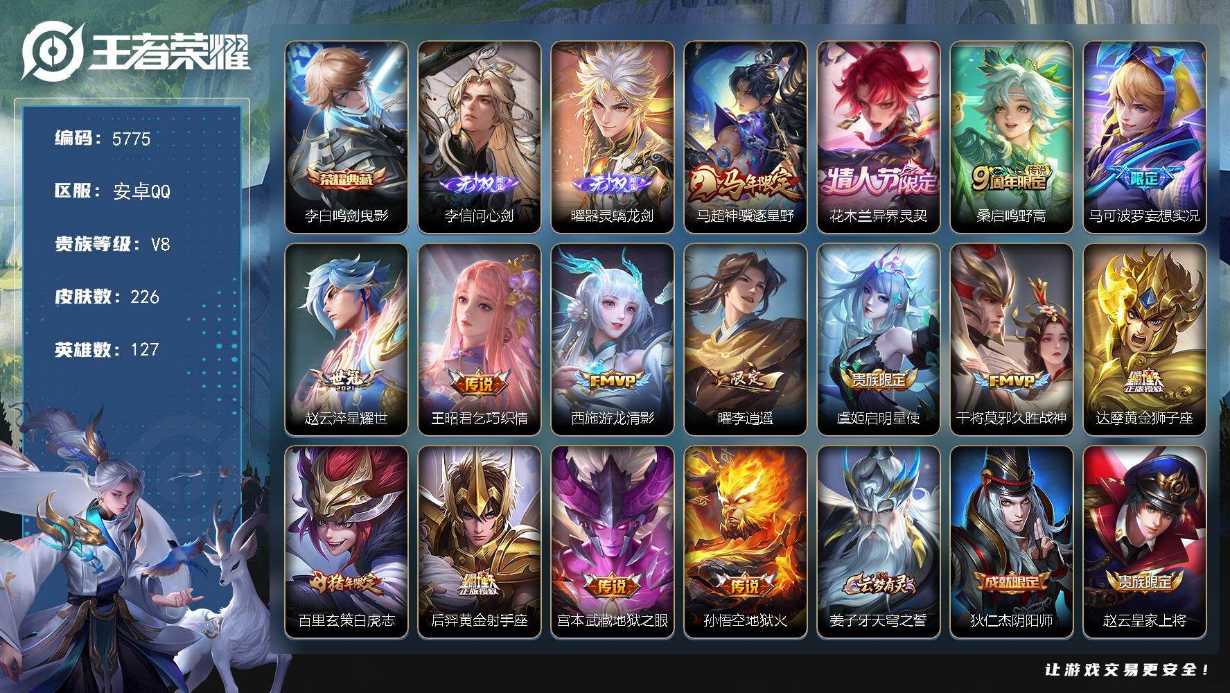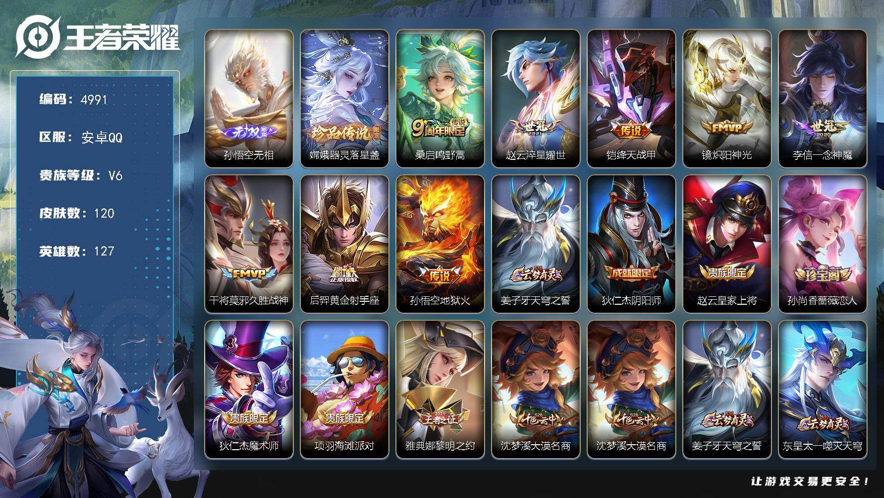 安卓Q-V6-最强王者段位-127英雄-120皮肤-1无双-1珍品传说-8传说