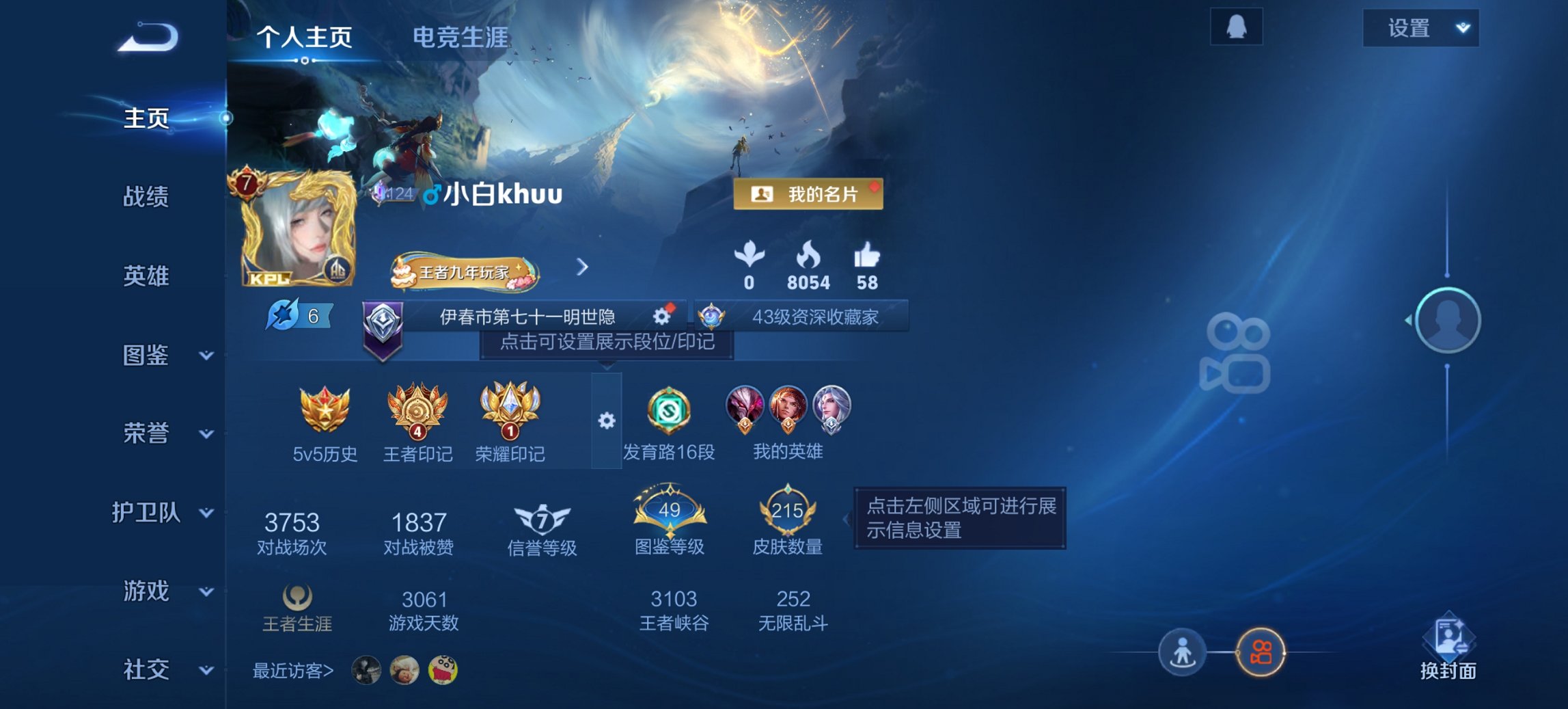 实名: 可修改 贵族等级: V7 英雄数: 127 皮肤数: 135 荣耀水晶