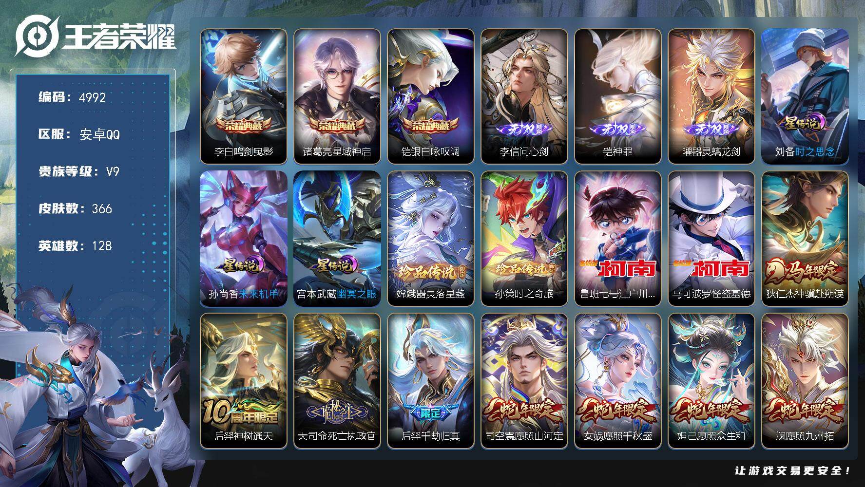 安卓Q-V9-最强王者段位-128英雄-366皮肤-3典藏皮肤-3无双-4珍品