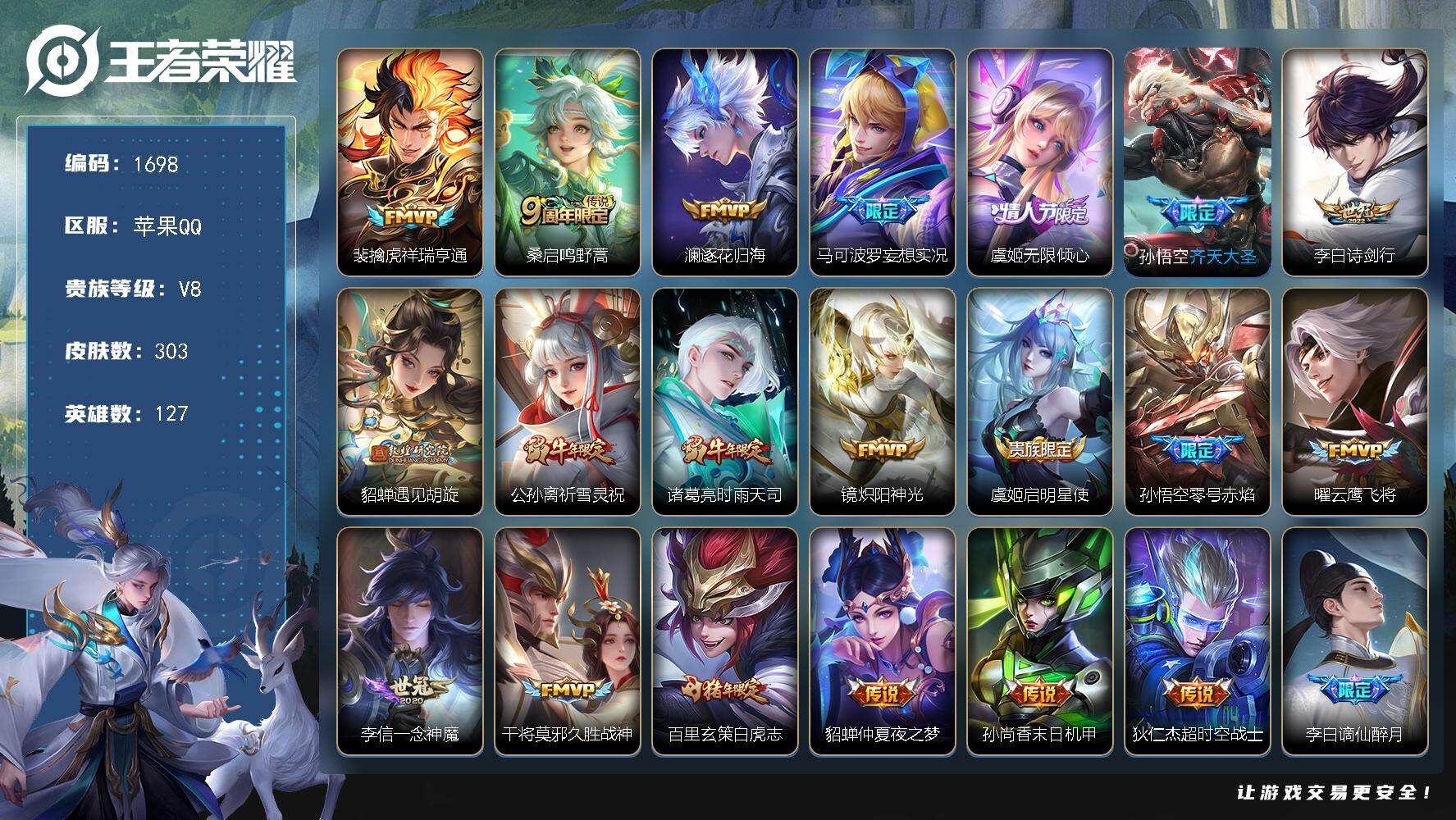 苹果Q-V8-至尊星耀V段位-127英雄-303皮肤-20传说-90史诗【英