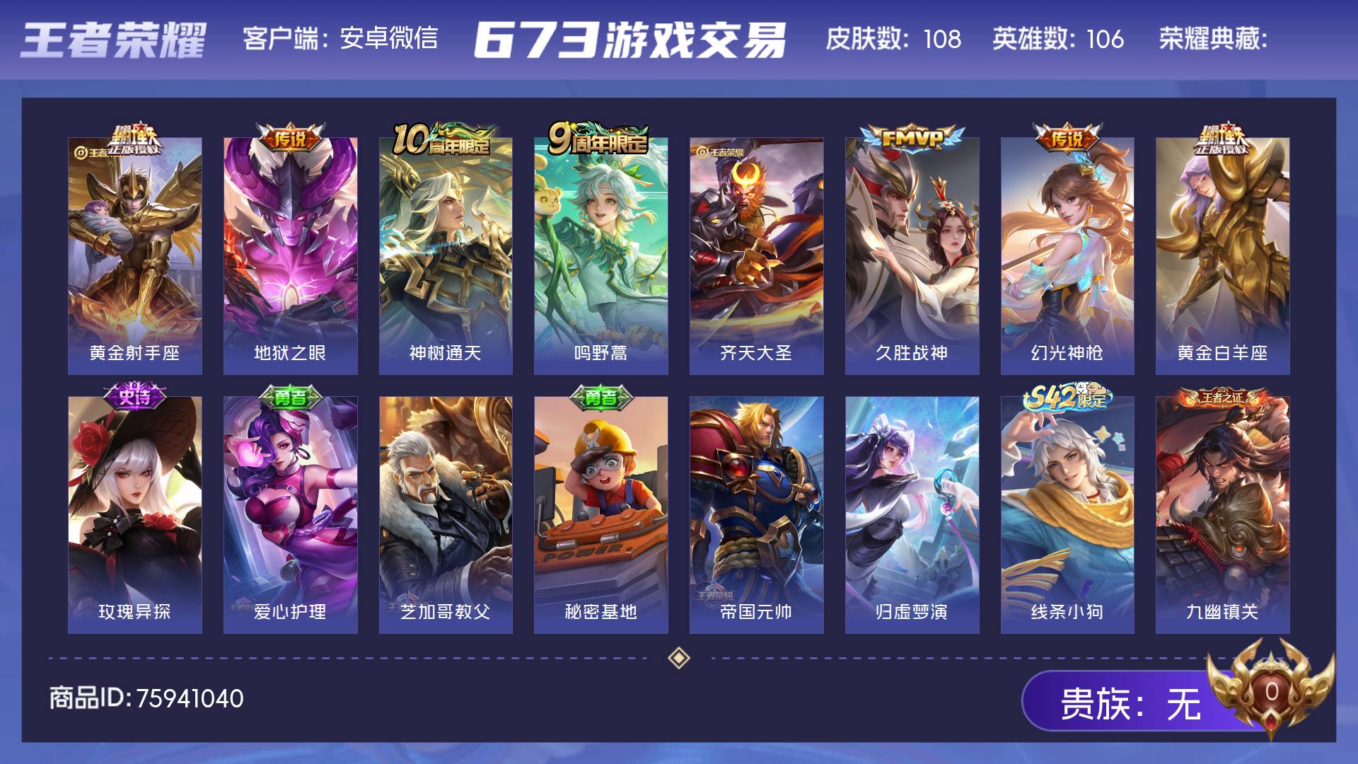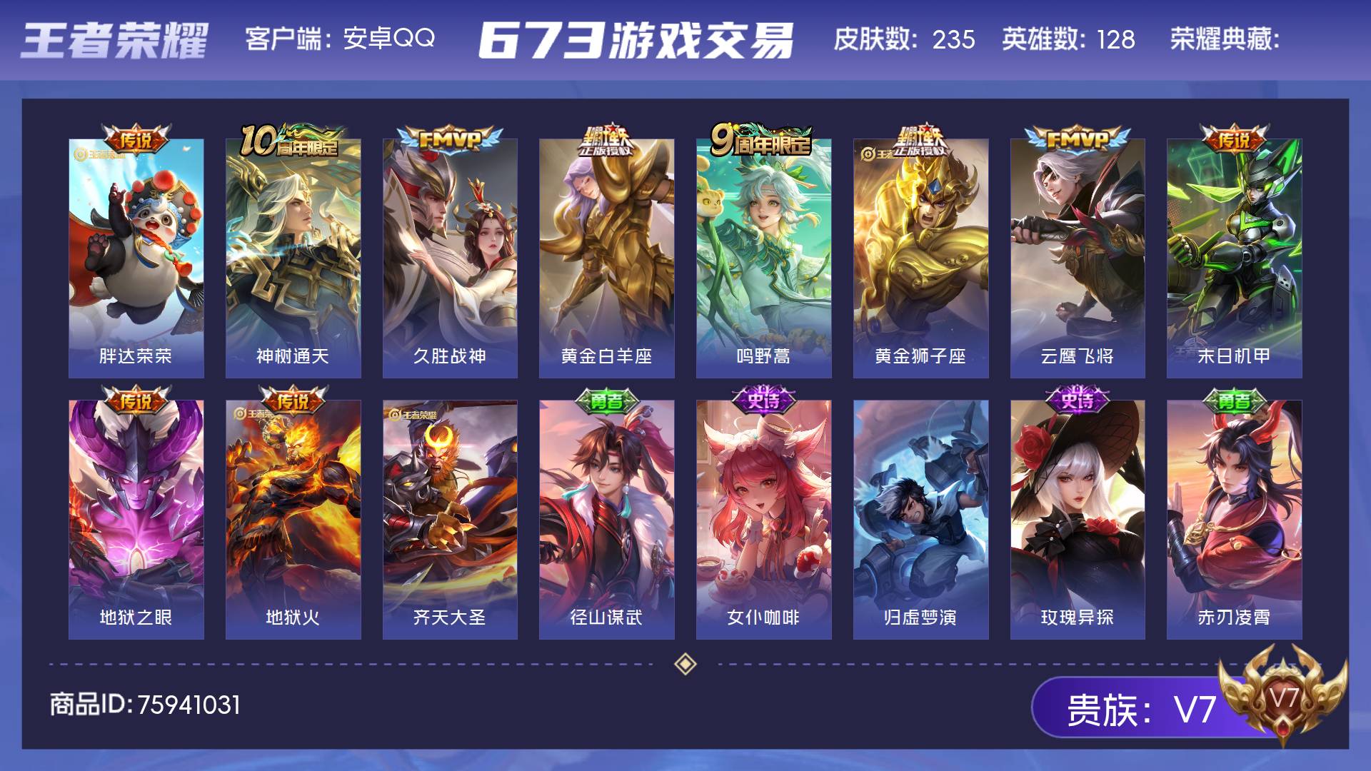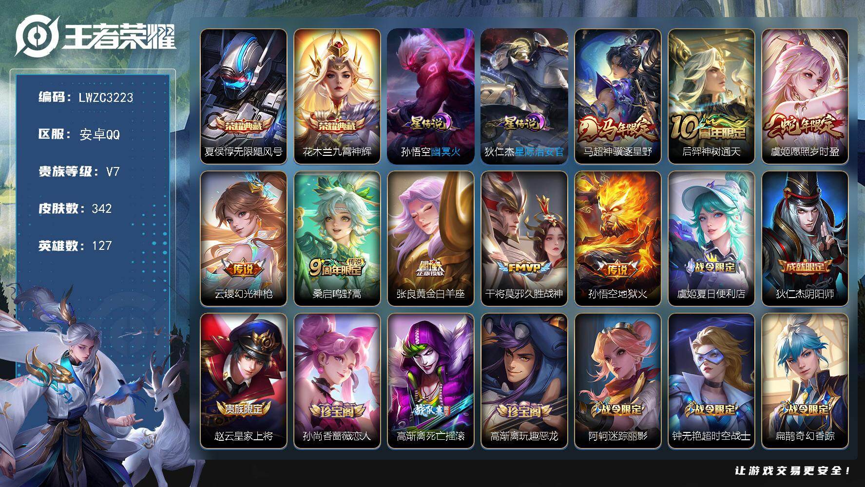 【金标达摩 金标貂蝉】实名: 可修改 贵族等级: V7 英雄数: 127 皮肤
