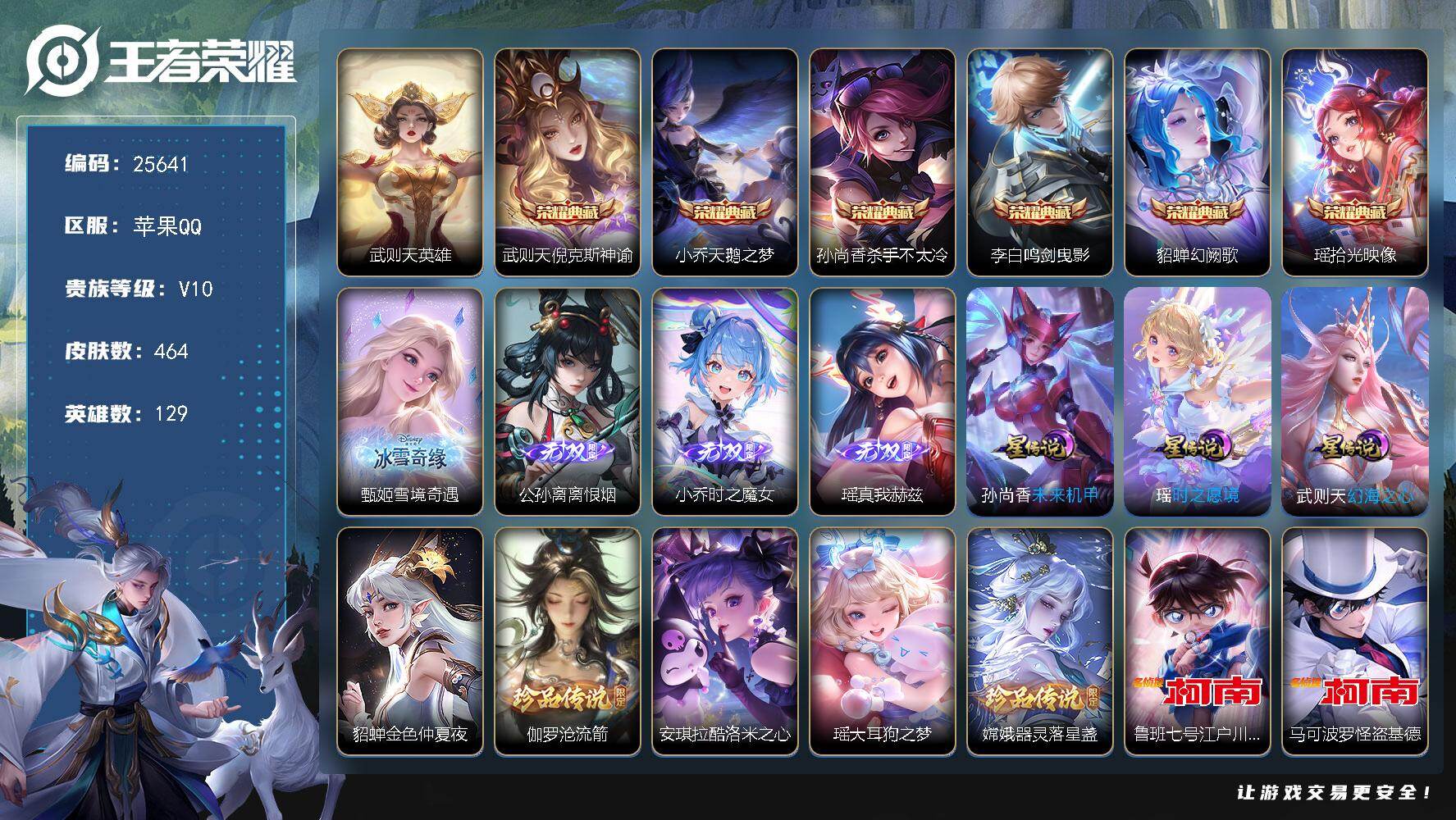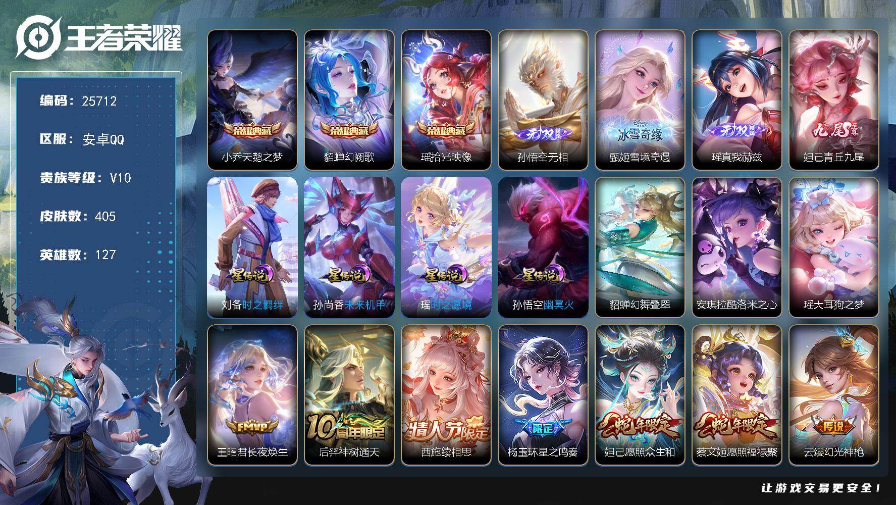 可换绑【V10精品号·瑶全皮·西施全皮·甄姬瑶妲己3无双·瑶貂蝉小乔3典藏·安琪