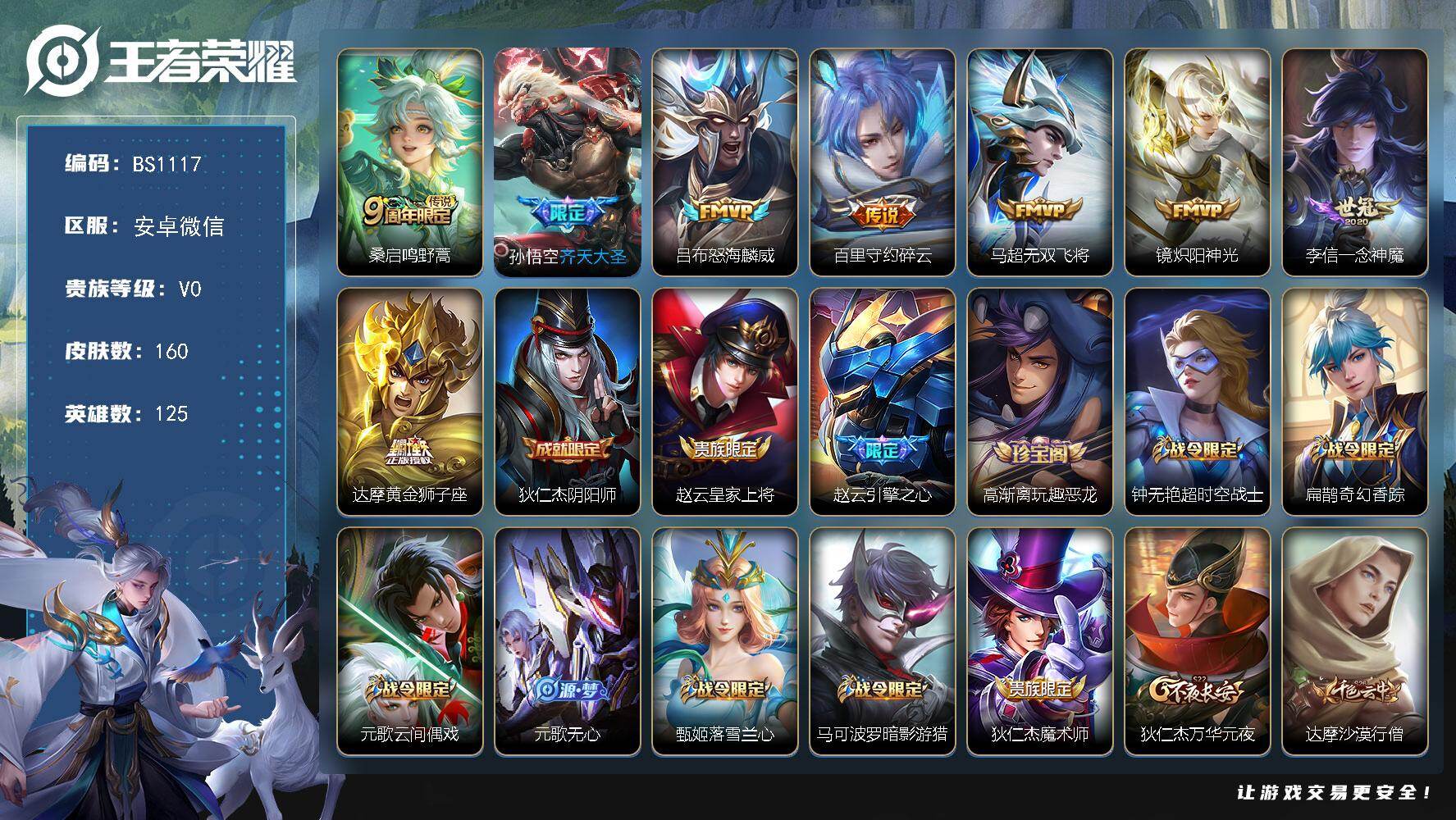 安卓WX-V0-荣耀黄金III段位-125英雄-160皮肤-8传说-35史诗