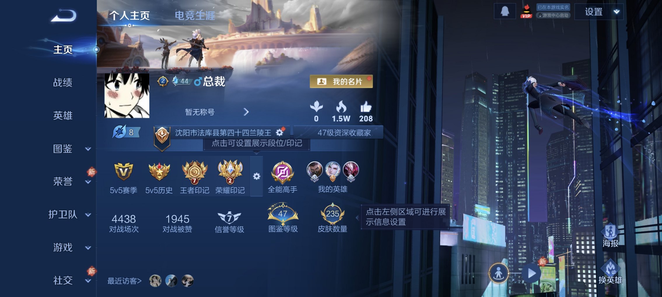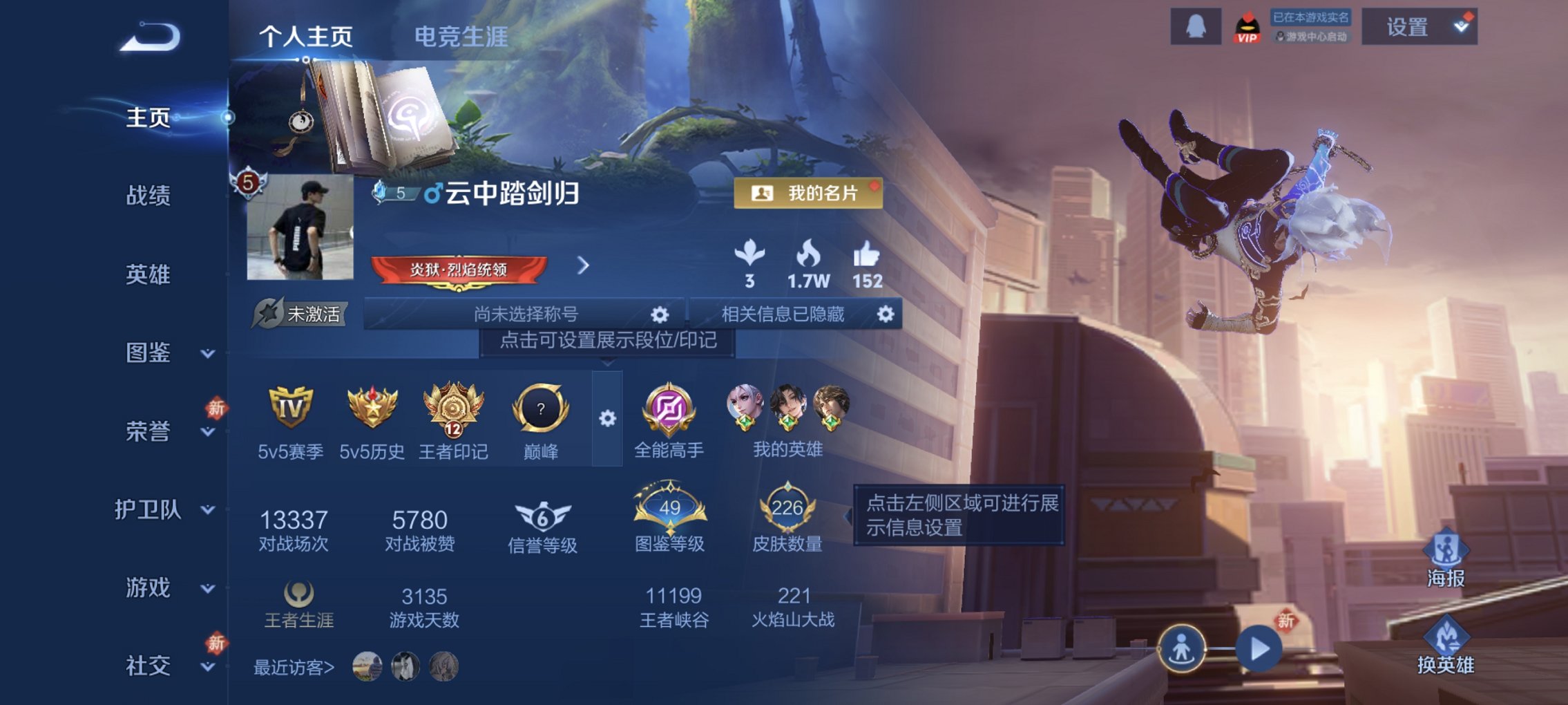 实名: 可修改 贵族等级: V8 英雄数: 125 皮肤数: 241 荣耀水晶