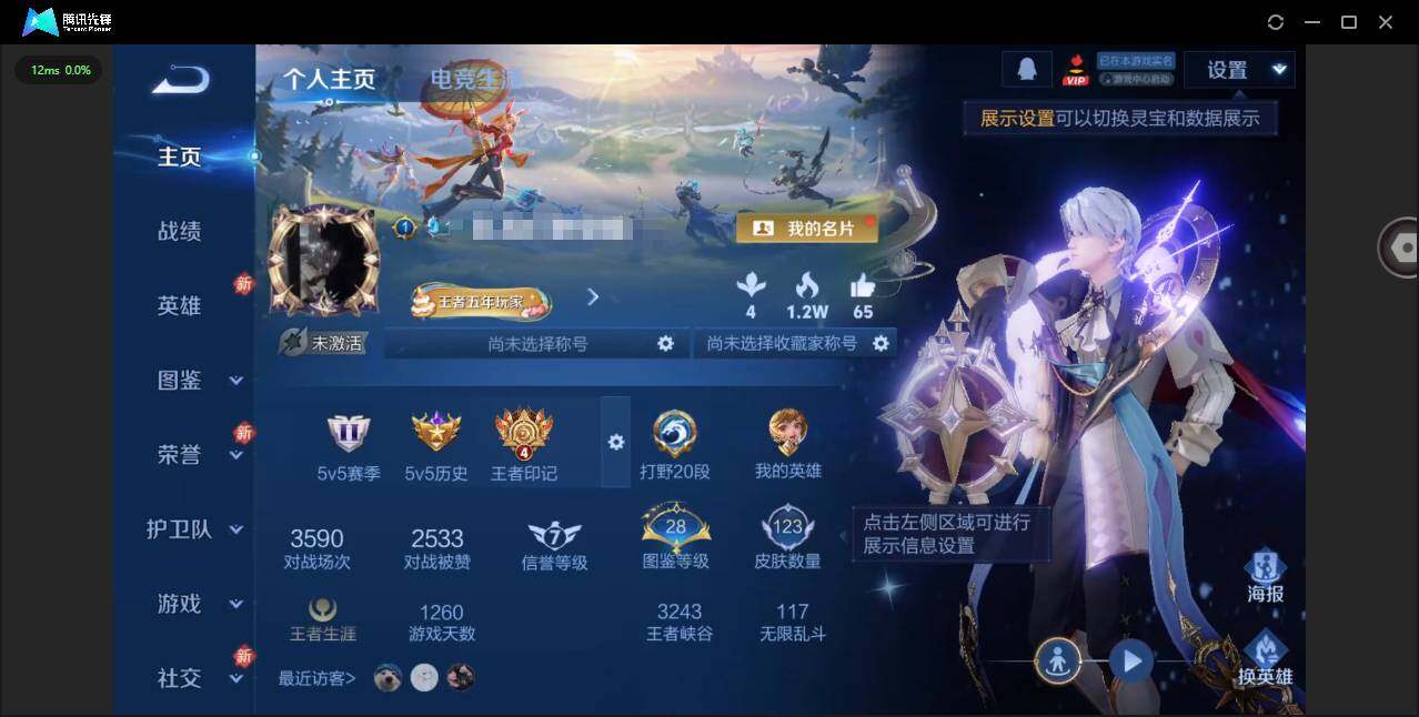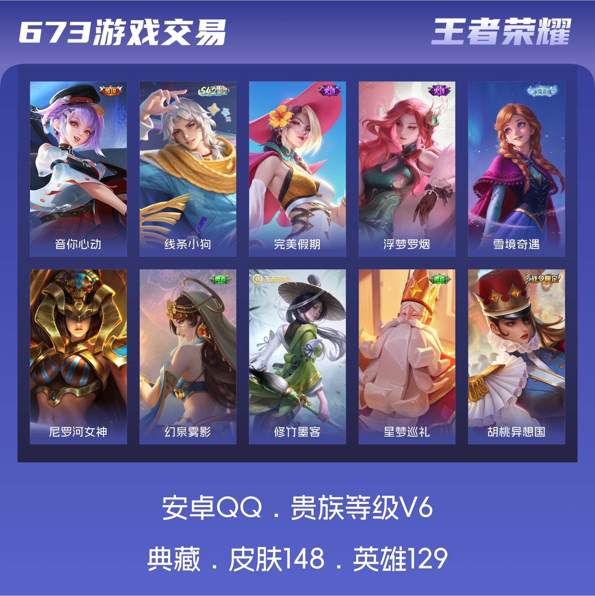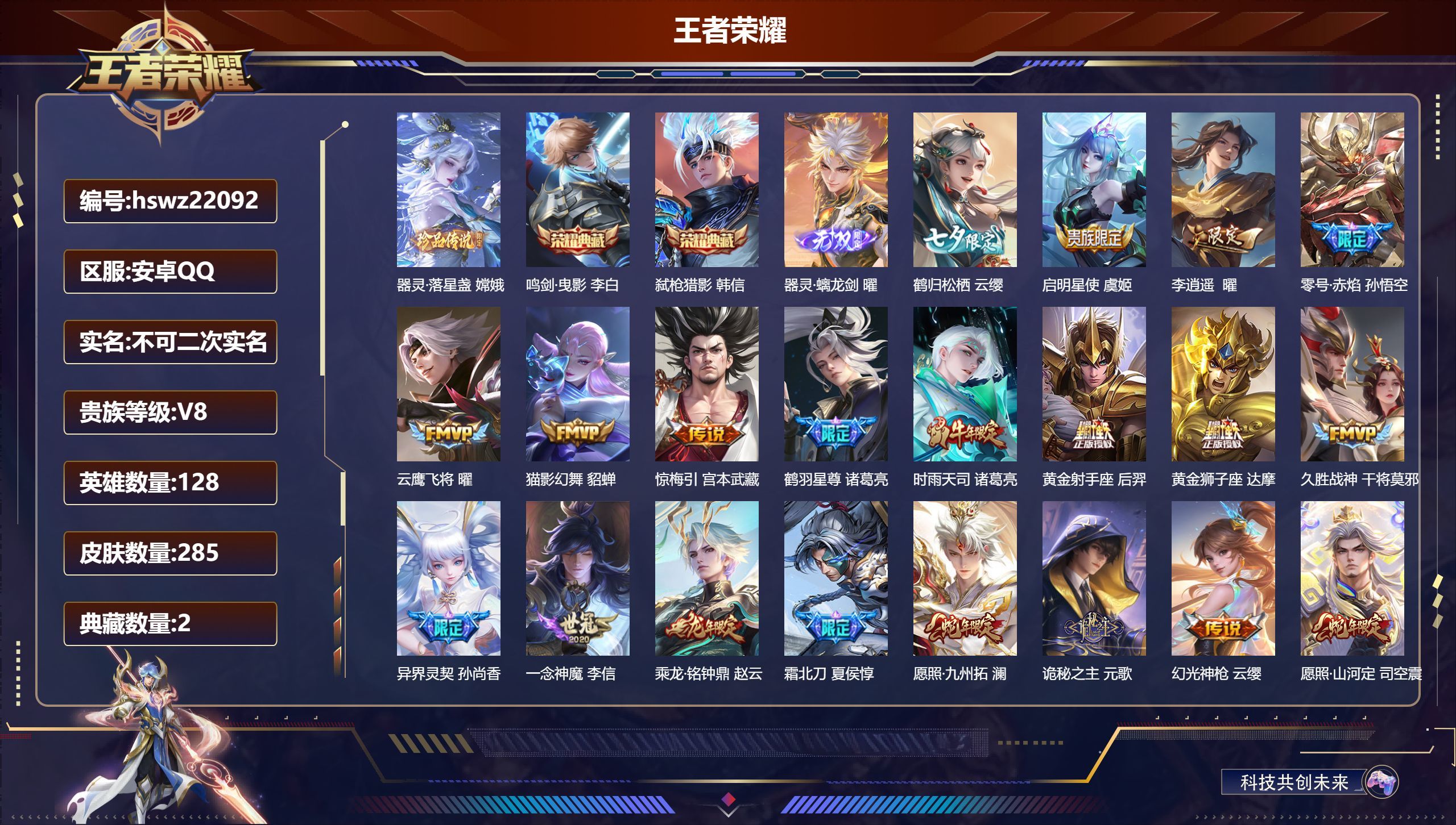 安卓QQ/至尊星耀/285皮肤/128英雄/2典藏/0珍品无双/1无双/1珍品传说/21传说/84史