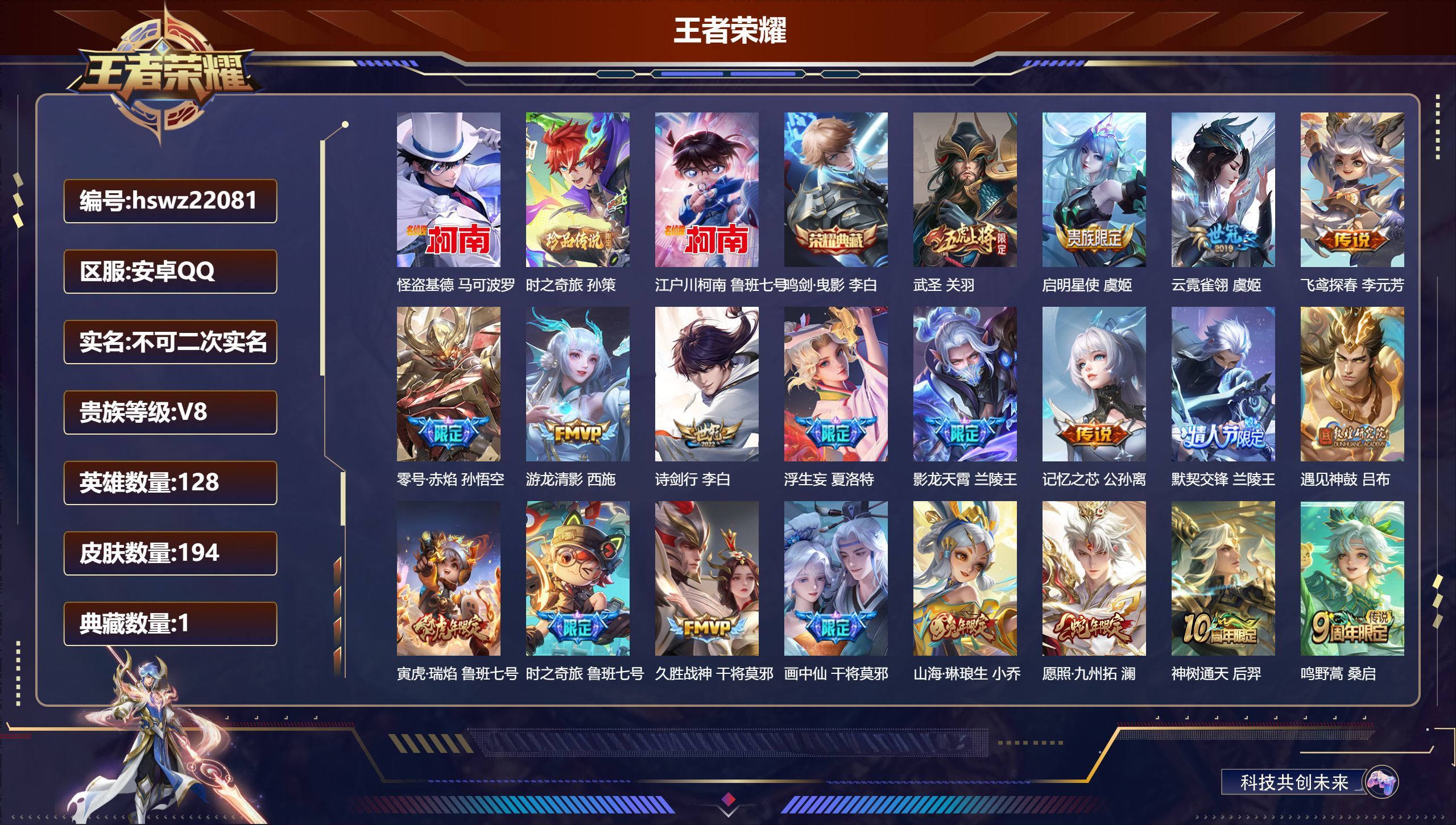 安卓QQ/永恒钻石/194皮肤/128英雄/1典藏/0珍品无双/0无双/3珍品传说/20传说/55史