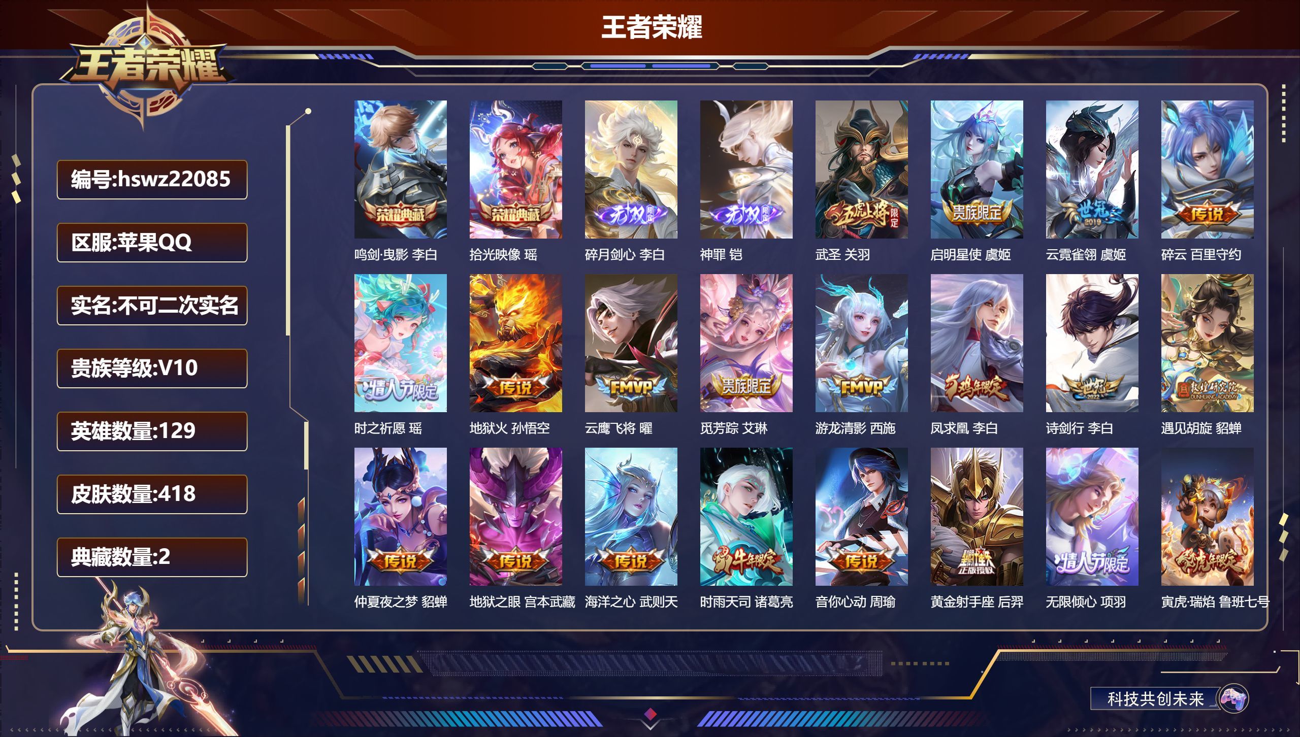 苹果QQ/最强王者/418皮肤/129英雄/2典藏/0珍品无双/2无双/0珍品传说/37传说/131