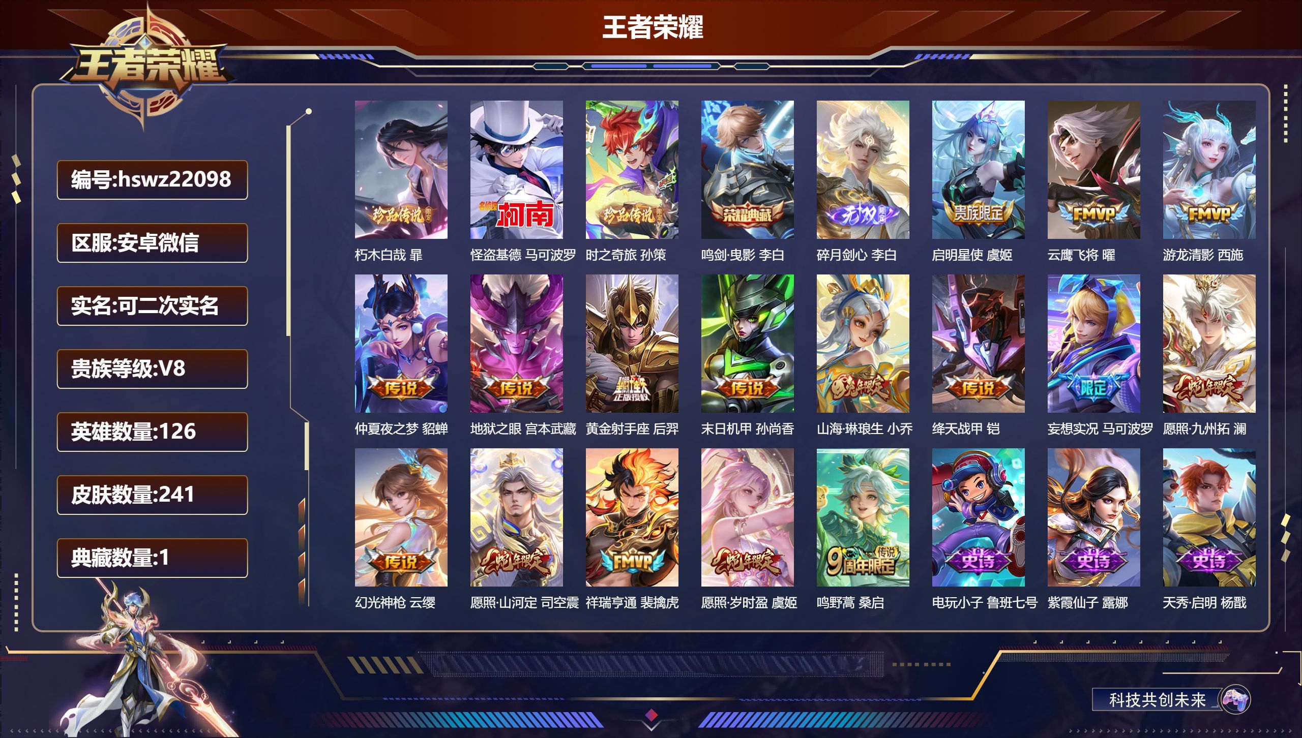 安卓v/最强王者/241皮肤/126英雄/1典藏/0珍品无双/1无双/3珍品传说/16传说/67史