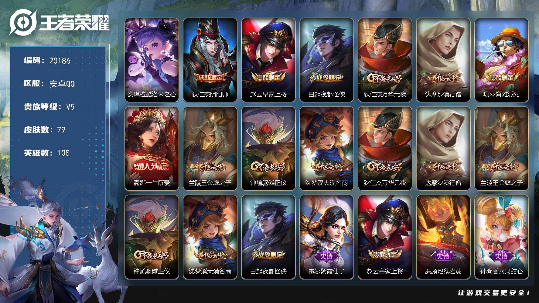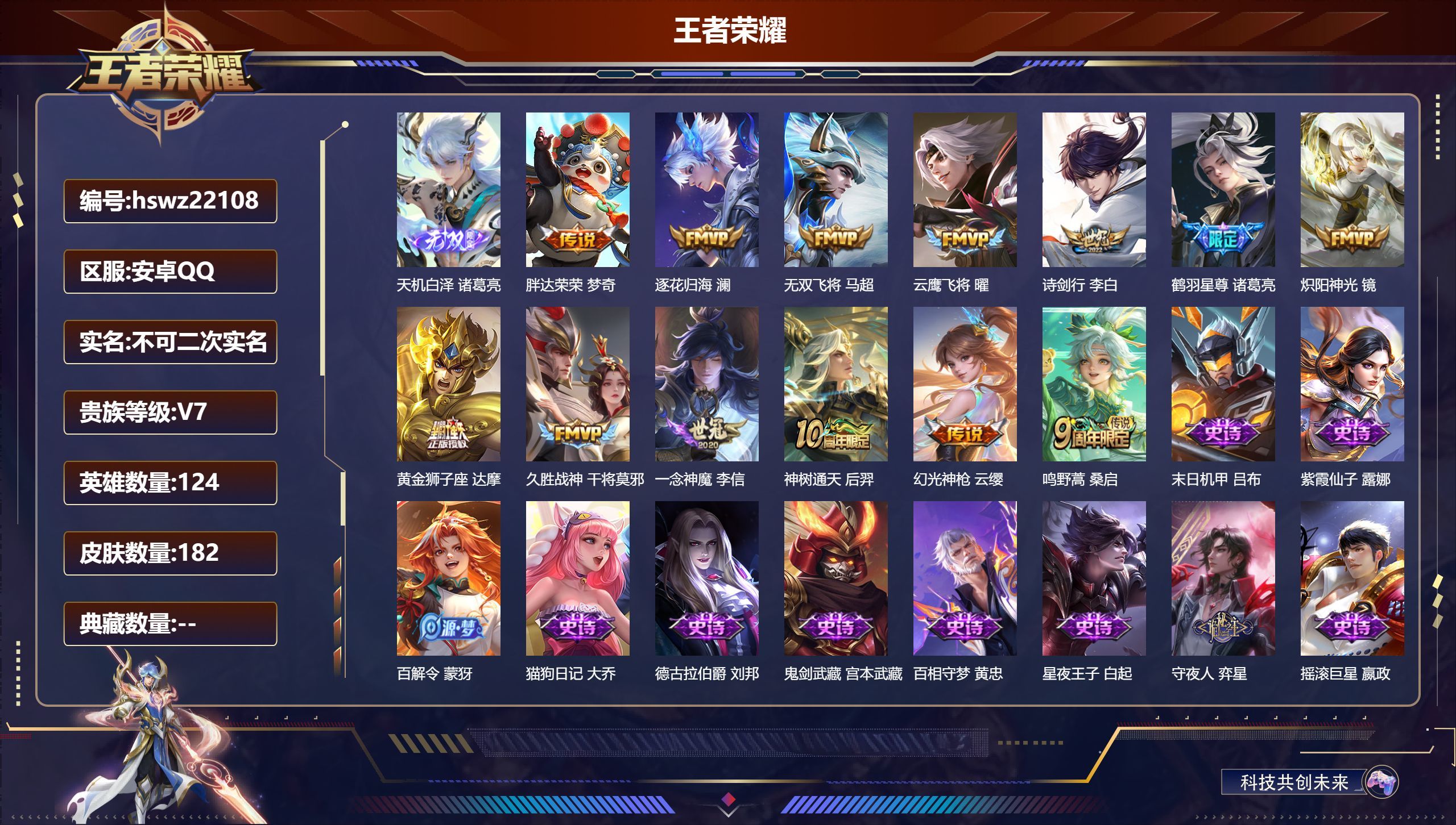 安卓QQ/至尊星耀/182皮肤/124英雄/0典藏/0珍品无双/1无双/0珍品传说/13传说/50史