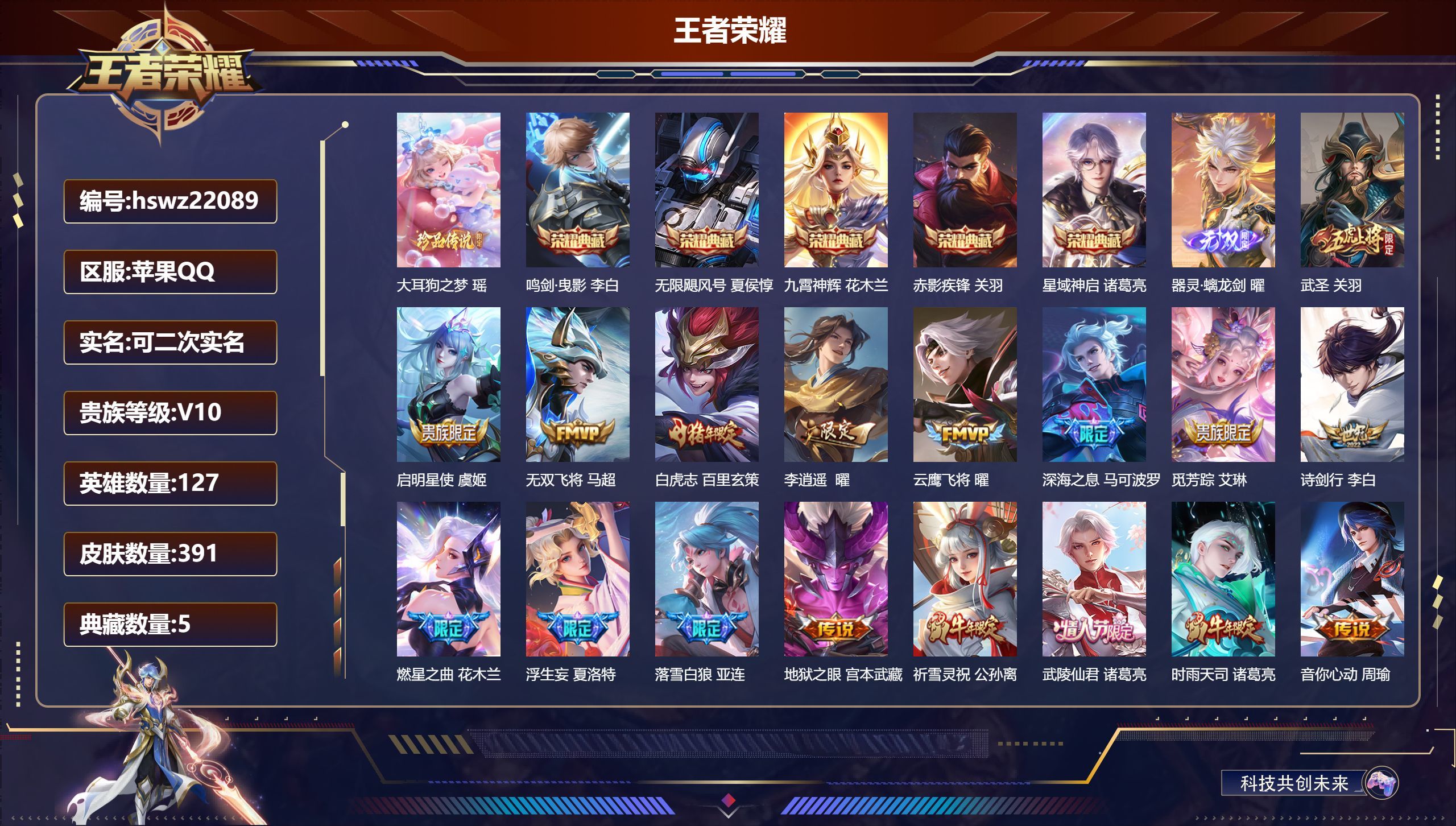 苹果QQ/荣耀王者/391皮肤/127英雄/5典藏/0珍品无双/1无双/1珍品传说/34传说/110