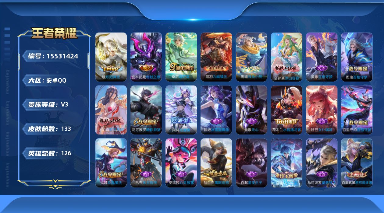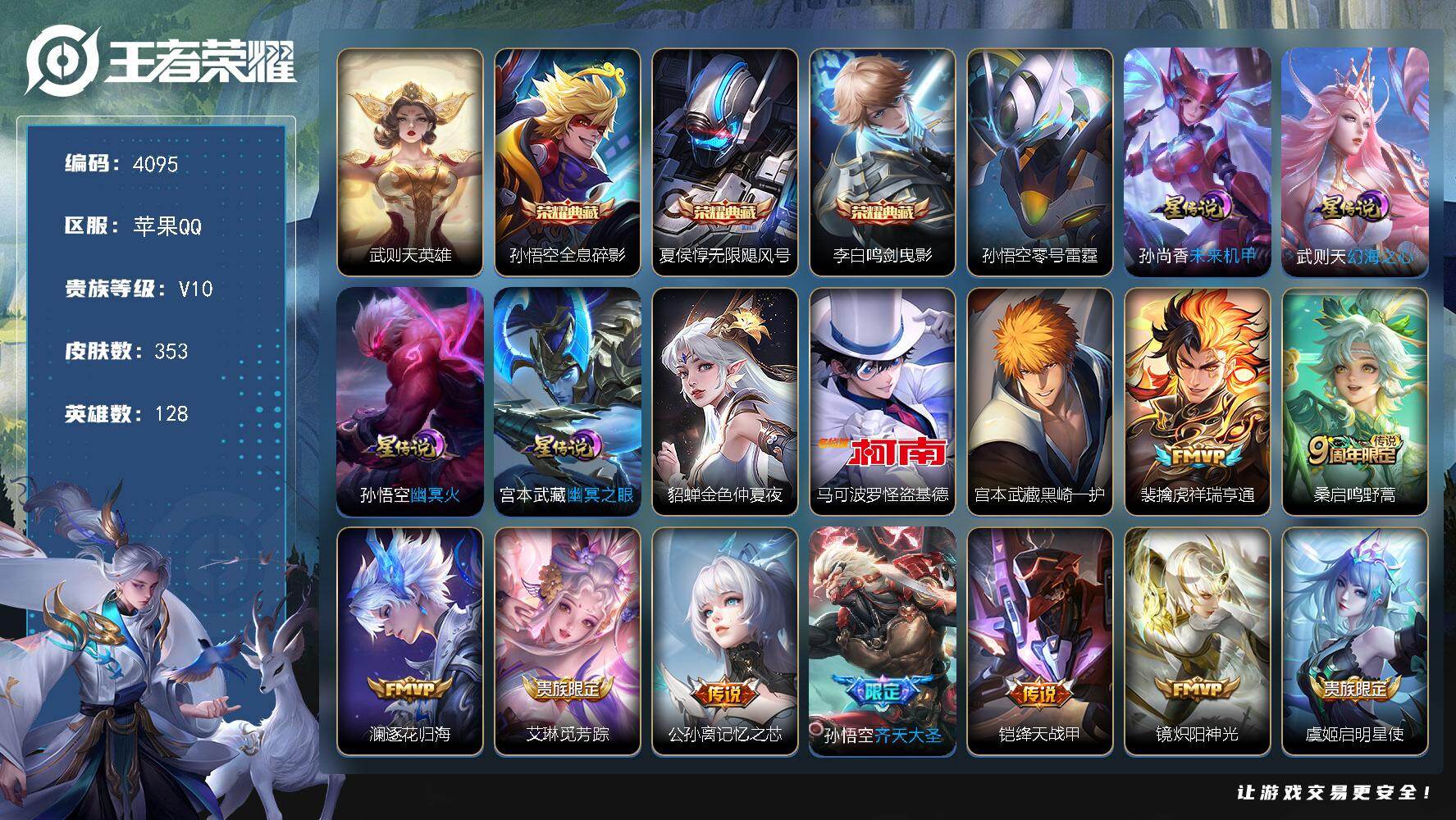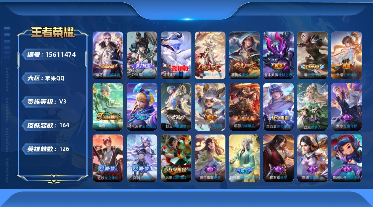 苹果Q-V10-至尊星耀III段位-128英雄-353皮肤-3典藏皮肤-1典藏