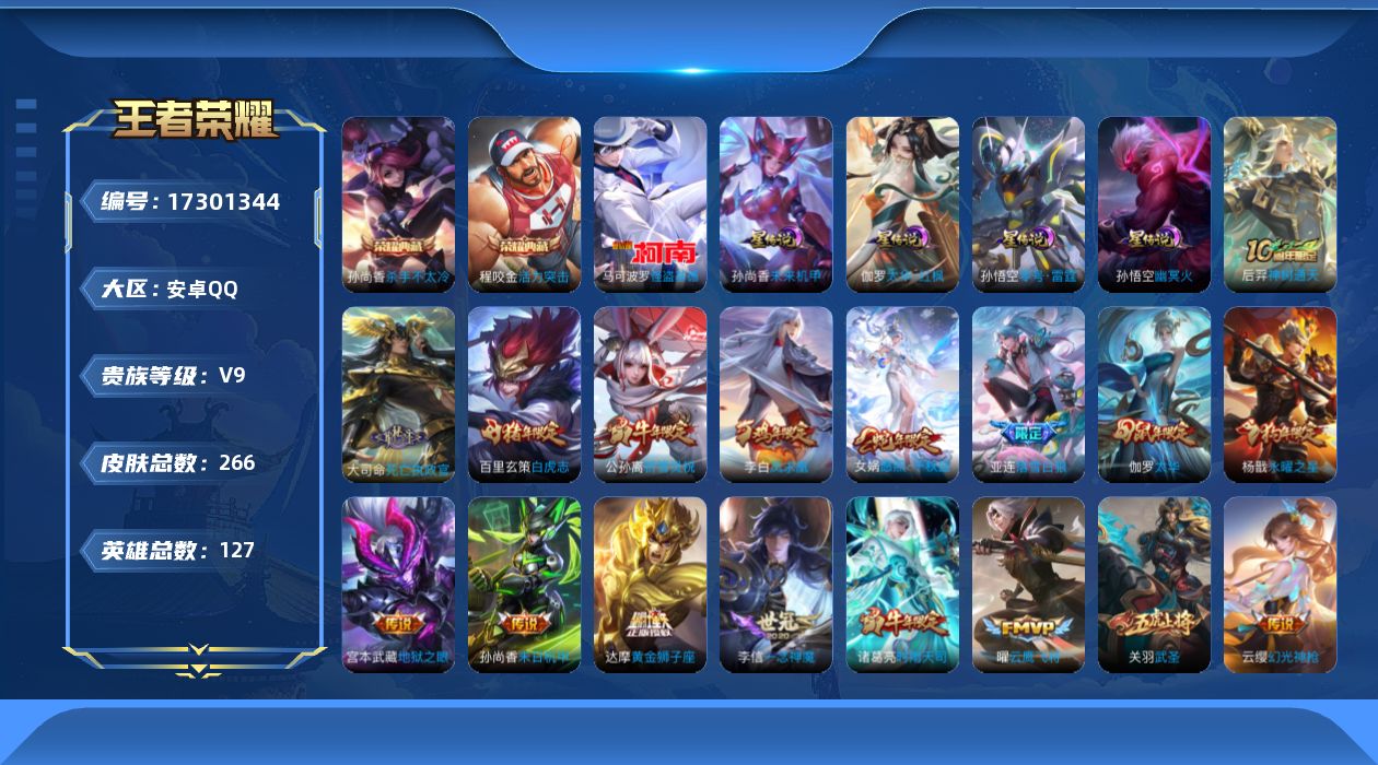 V9 皮肤290 至尊星耀 荣耀典藏6 无双皮肤1 珍品传说1 传说17 其他皮肤273